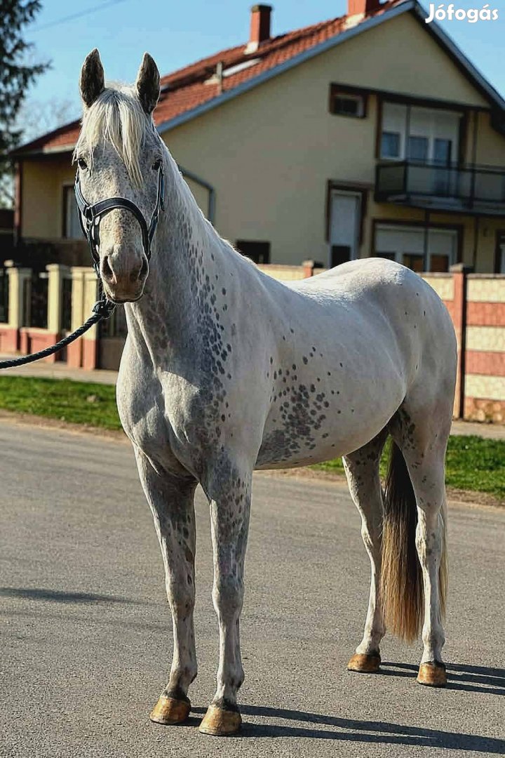 140 cm marmagasságú, szép megjelenésű, különleges pöttyös krém színű póni. Belovagolt és bekocsizott, munkában megbízható. Nagyon szelíd, nyugodt természetű, könnyen kezelhető, ezért kezdőknek vagy gyerekek mellé is jó választás lehet.