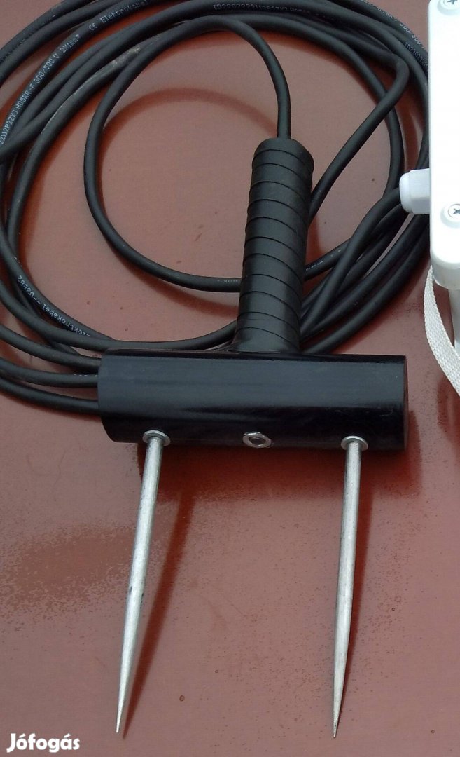 5-méteres munka kábel anyaga gumi.Müanyag vastag anyagu doboz.A szurótüske átmérője 7mm a feketeszinü tömör kör alakú müanyag 40mm.Tekercselö álltal gyártott egyedi transzfomátor 80-130v teljesen biztos a sertéslefogásában, az állatok izom és testtömegéhez beállítható két különböző feszültségű kis és nagy súlyhoz tartozó kapcsolóval ellátott készülék {500kg}-ig és azon túl is {a nagysúlyú sertés biztos lefogása kizárólag csak nagyobb feszültséggel lehetséges. számtalan példa van arra amikor kisebb feszültség esetén a sertés nem ment le.Pl. 50v-os vagy még annál is kisebb feszültség ami csakis malacokra alkalmas. A kézben tartott szúróvilla markolati része a gumírozás alatt fém, ha sertés rádől nem törik el. A hálózati csatlakozó kábel rövid mérete 50cm azért van mert minden esetben mindenkinél a hely ahol a munkavégzés történik eltérö távolságú. Egyedi hosszúságú hosszabitót igényel. .{Az emberre egyes hiresztelések ellenére egyáltalán nem veszélyes Ha felhiv elmondom miért. Amúgy tudni kell hogy ez egy Szakma tehát ezt valaki vagy tudja vagy pedig tudatosan megtéveszt másokat. .Garancia a villamos szakmában ledolgozott 49 év.