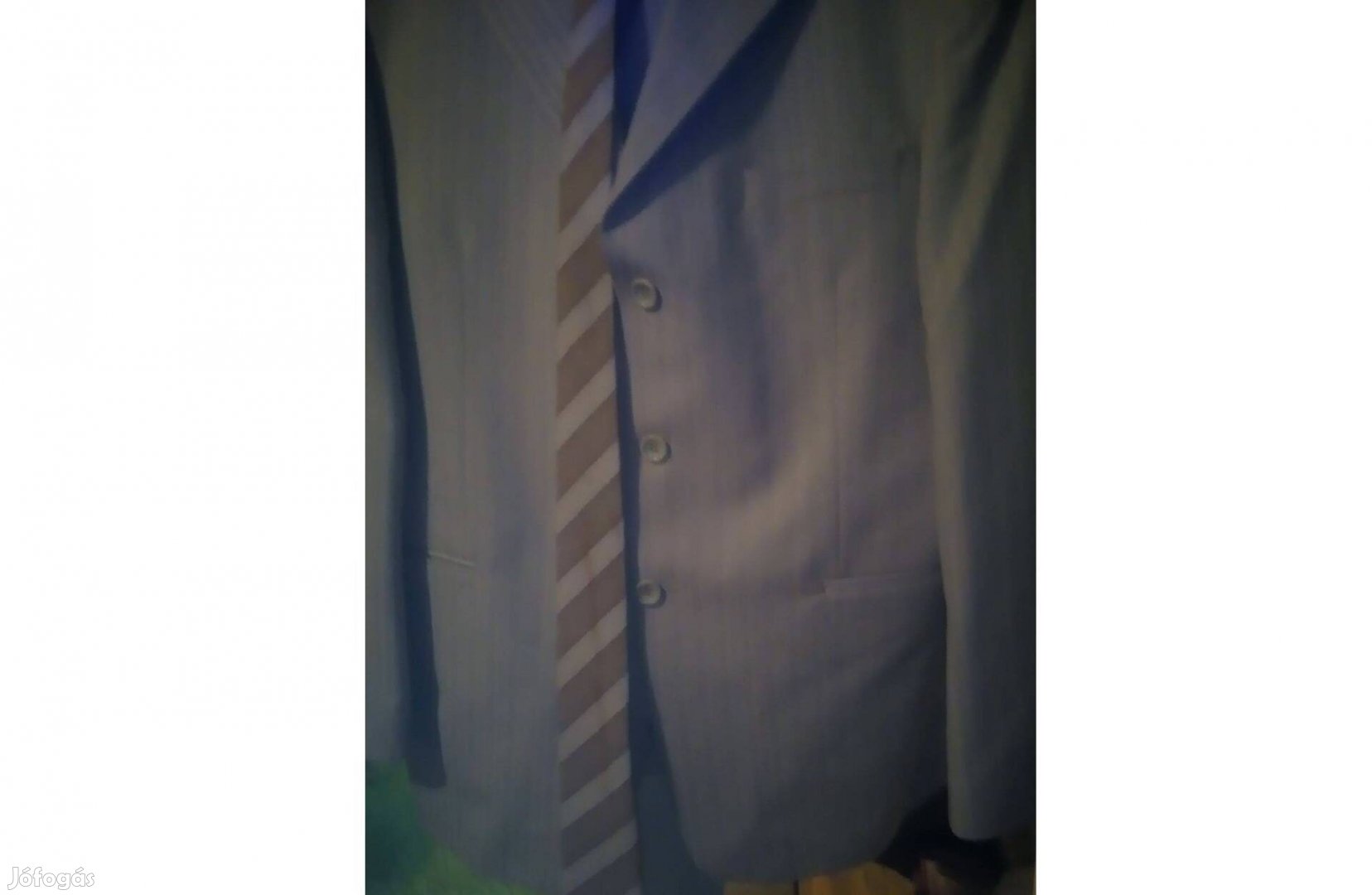 Egyszer használt nagyméretű férfi öltöny,bézs drapp csikokkal.Zakó,nadrág,mellény,nyakkendő.Esküvőn az örömapa viselte.Szállitás megoldható.