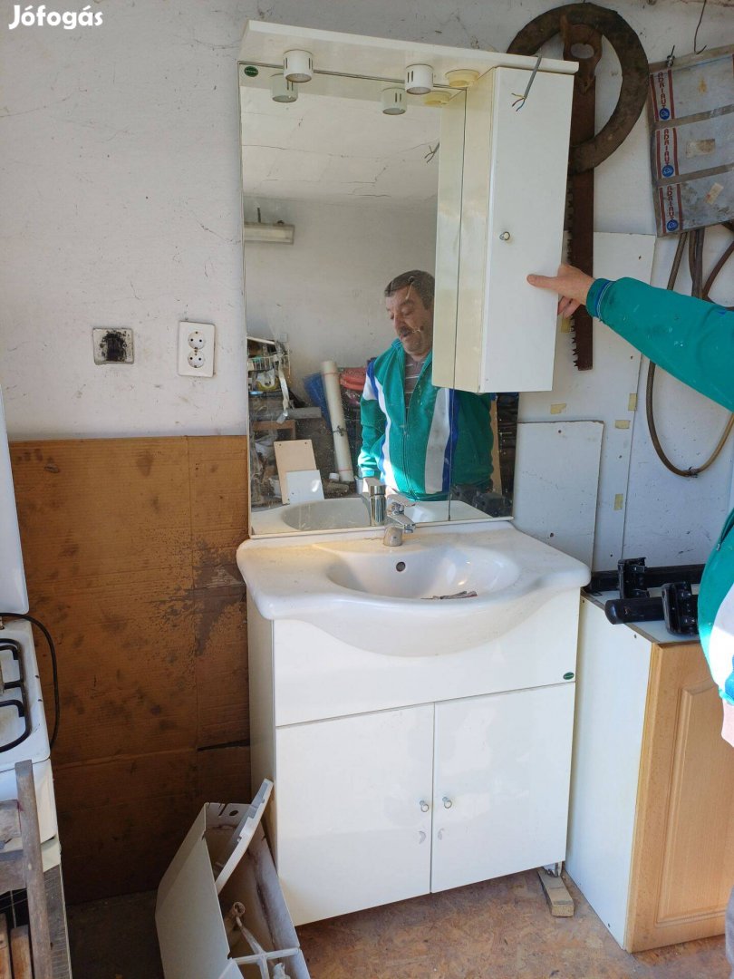 Fürdőszobabútor mosdóval, csapteleppel, tükörrel.