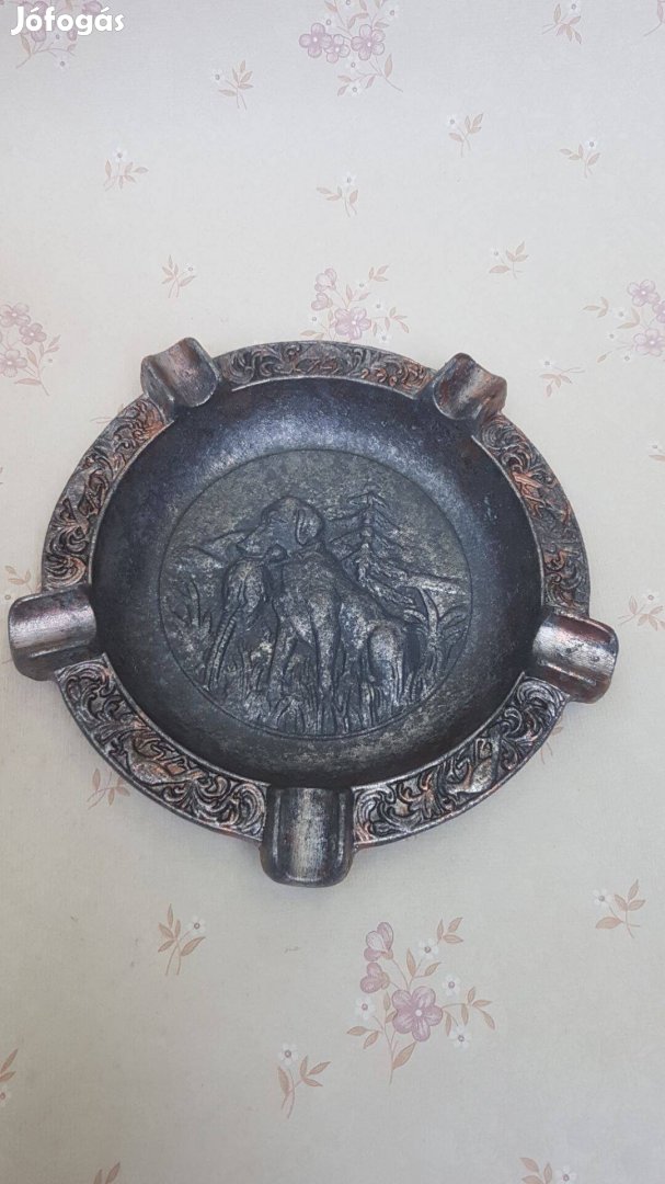 Eladó a képeken látható különleges ritka, régi, retró hamutál - hamuzó, mely masszív alumínium öntvényből készült. A közepén egy vadász jelenettel, részletgazdagon megformált vadászkutya űl a szájában a kilőtt zsákmánnyal, egy fácánnal. A hamutál egy mutatós dísztárgy lehet, egy vadász témájú gyűjtemény darabja, de legfőképp egy vadász asztalkáján mutatna a legjobban. Maximális átmérője 21,5 cm. Állapota korának megfelelő, használatból eredő kisebb kopásokkal, amelyek inkább a patináját erősítik. Szállítással megrendelhető. Ára: 13500,-;