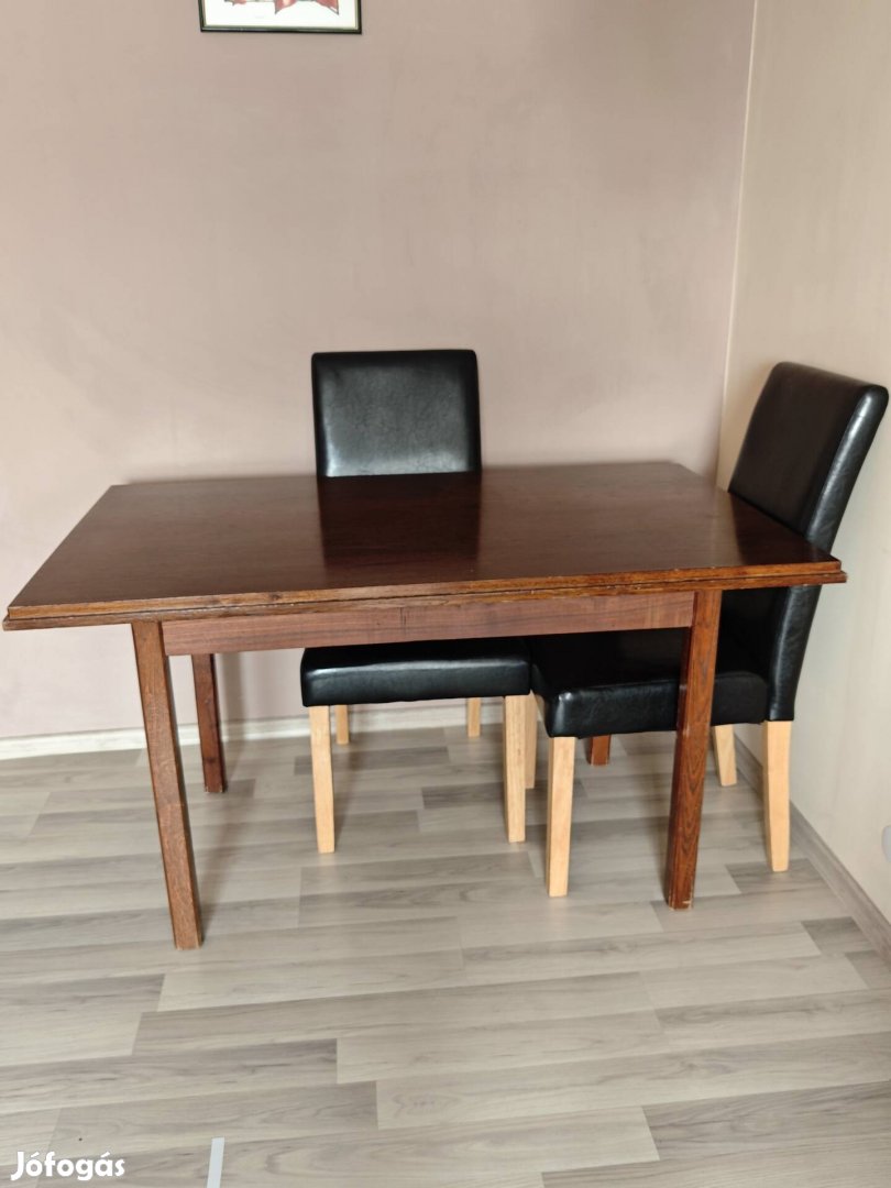 Helyhiány miatt eladó fa étkezőasztal. Nem bővithető. Méretek: sz: 80,5 cm, h::134.5 cm, m: 73.5 cm. A székek nem eladók, csak az asztal.
