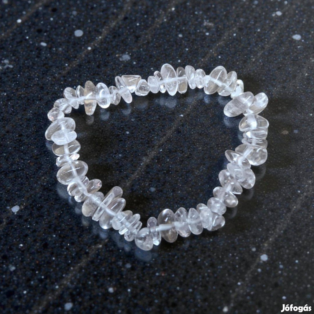 Különböző formájú és méretű ásványszemcsékből gumis damilra fűzött karkötő.
