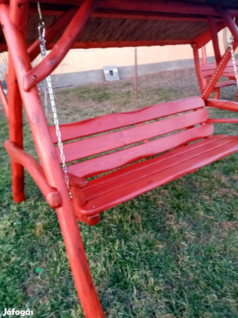 A hintaágy akác rönkből készült. Jó minőségű vastag lazúrfestékkel van festve három rétegben.Az ülőke 200cm hosszú.A a tető zsindely vagy cserepes lemez.A szállítás kedvezményesen megoldható.
