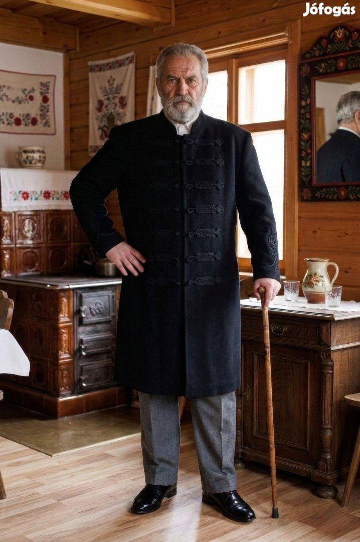 Eladó egy elegáns, tradicionális hosszított fazonú Bocskai öltöny (zakó + nadrág). Fekete színű, nagy méretű.