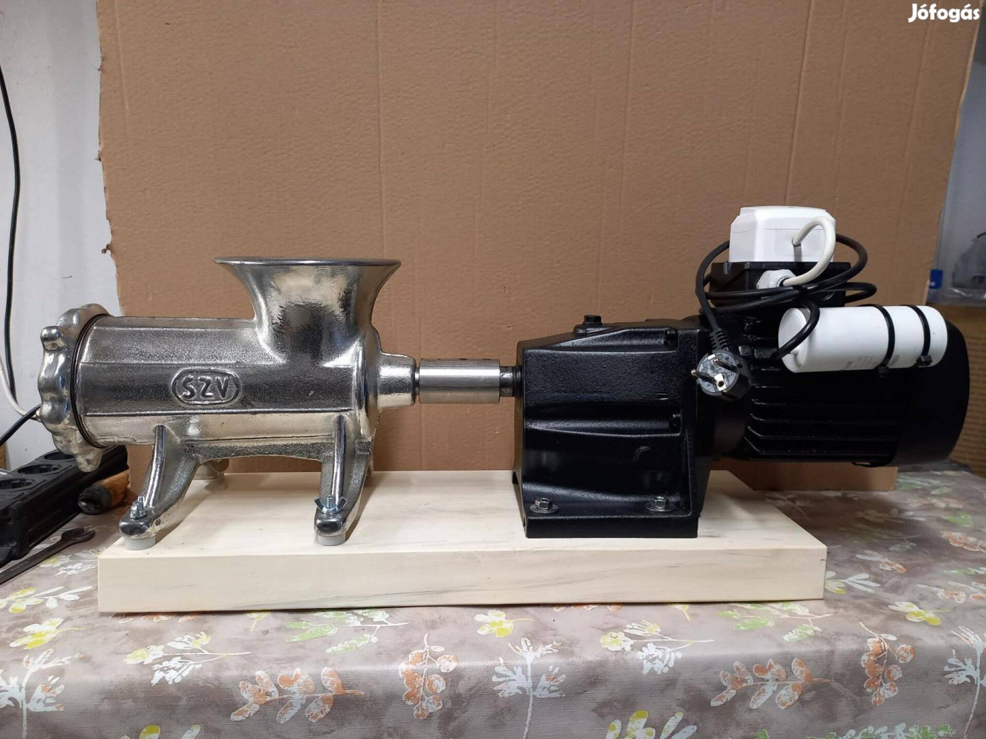 Szarvasi húsdaráló csapágyazva perselyezve, gyári ónozás,csendes erős motor. új kés, új rostély kisipari. 80 as fordulat.