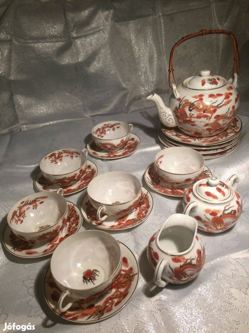 Eladó a képeken látható gyönyörű és egyben különleges japán tojáshéj porcelán teás - süteményes készlet. A csészék leheletnyi finom porcelánból készültek, átmérőjük 10.8 cm. A készlet tartalmaz 6 db csészét, hozzá 6 db alátét kistányért, átmérőjük 13,5 cm. Egy cukortartót, valamint egy kancsócskát. Egy nagyméretű kínáló kiöntőt porcelán szűrővel, valamint van a készlethez 6 db süteményes kistányér melynek átmérője 18,5 cm. A készlet sárkány motívumokkal készült, arany díszítéssel. Egy pohárnak a széle sérült, darabja is meg van hozzá, utolsó képen látható. Különleges, mutatós, és egyben elegáns készlet. Szállítással kapcsolatban kérem hívjon vagy írjon. Ára: 42500,-;