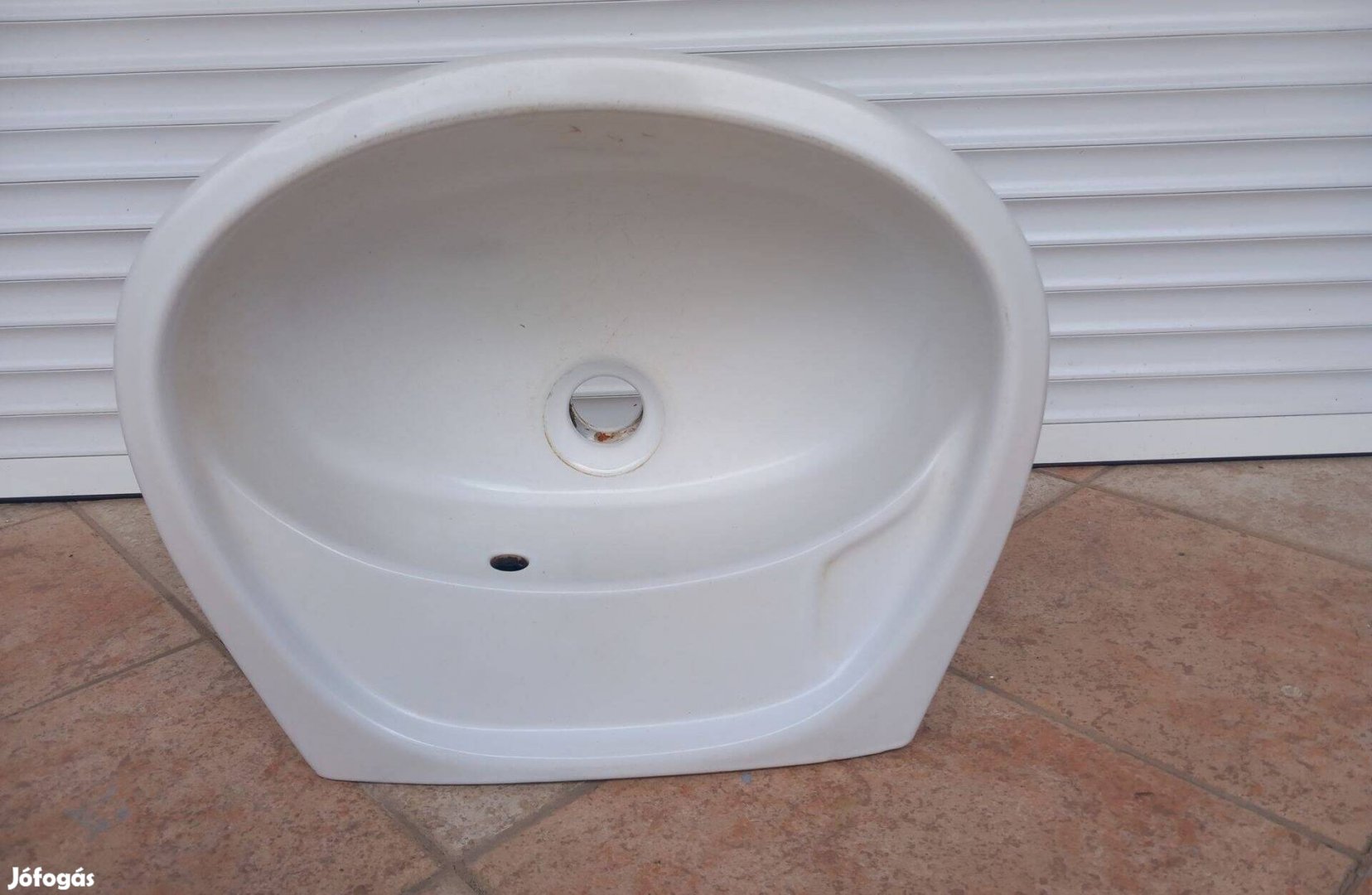 Eladó a képen látható közepes méretű fehér mosdókagyló használt, de sérülésmentes, hibátlan állapotban. Legnagyobb szélessége 44 cm, mélysége 37 cm.