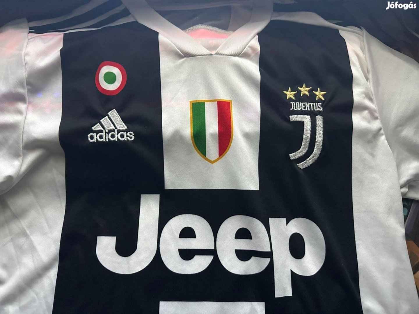 Elől az Adidas felirat és a Juventus felirat hímzett, az Olasz pajzs nem hímzett.