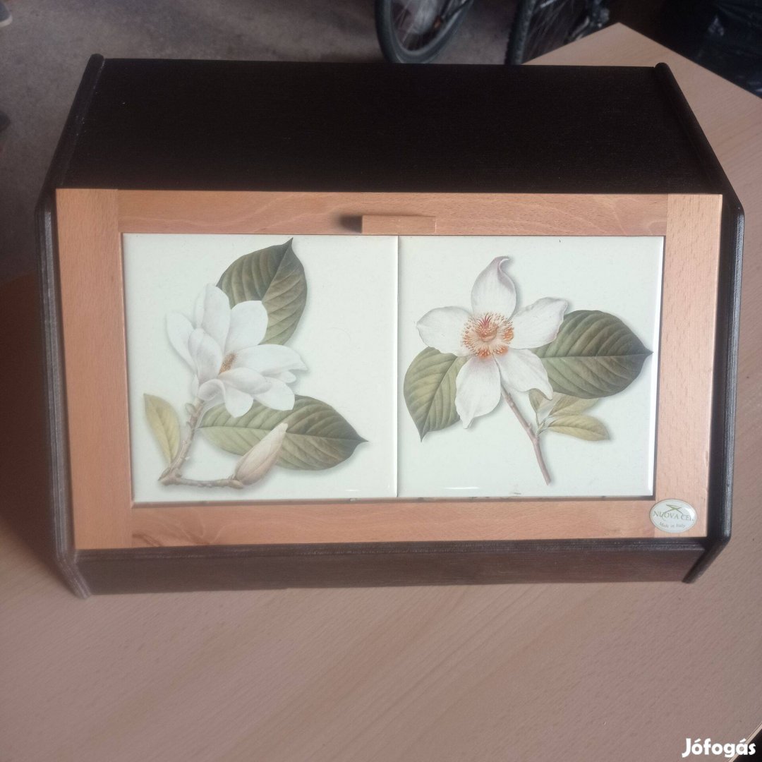 A képen látható új állapotú (szerintem hibátlan) Nuova Cer márkájú, olasz gyártmányú, fából készült és kerámiával (csempével) díszített kenyértartó Békéscsabán eladó. Az új ára a gyártó honlapján 75 euró.
