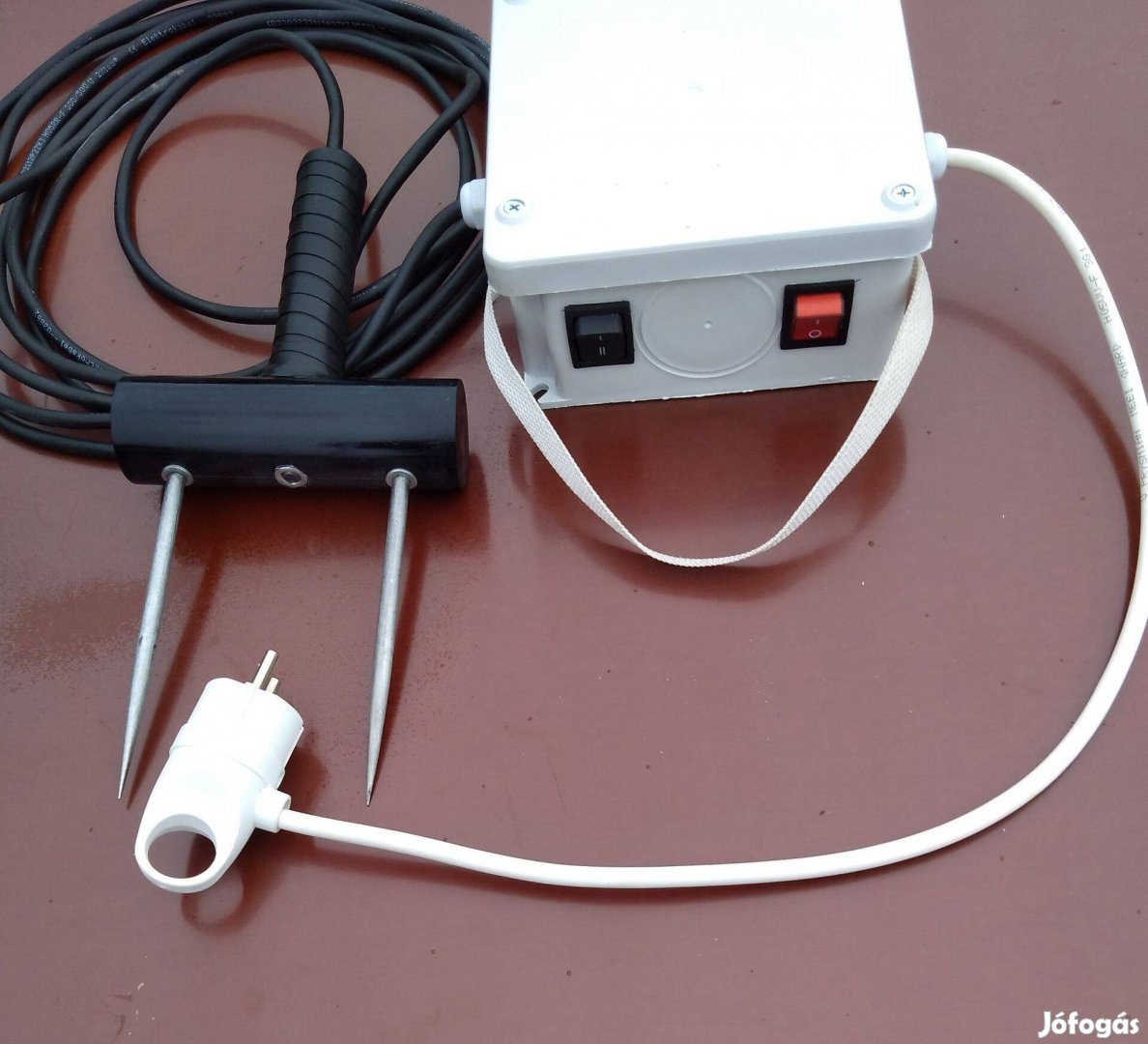 5-méteres munka kábel anyaga gumi.Müanyag vastag anyagu doboz.A szurótüske átmérője 7mm a feketeszinü tömör kör alakú müanyag 40mm.Tekercselö álltal gyártott egyedi transzfomátor 80-130v teljesen biztos a sertéslefogásában, az állatok izom és testtömegéhez beállítható két különböző feszültségű kis és nagy súlyhoz tartozó kapcsolóval ellátott készülék {500kg}-ig és azon túl is {a nagysúlyú sertés biztos lefogása kizárólag csak nagyobb feszültséggel lehetséges. számtalan példa van arra amikor kisebb feszültség esetén a sertés nem ment le.Pl. 50v-os vagy még annál is kisebb feszültség ami csakis malacokra alkalmas. A kézben tartott szúróvilla markolati része a gumírozás alatt fém, ha sertés rádől nem törik el. A hálózati csatlakozó kábel rövid mérete 50cm azért van mert minden esetben mindenkinél a hely ahol a munkavégzés történik eltérö távolságú. Egyedi hosszúságú hosszabitót igényel. .{Az emberre egyes hiresztelések ellenére egyáltalán nem veszélyes Ha felhiv elmondom miért. Amúgy tudni kell hogy ez egy Szakma tehát ezt valaki vagy tudja vagy pedig tudatosan megtéveszt másokat. .Garancia a villamos szakmában ledolgozott 49 év.