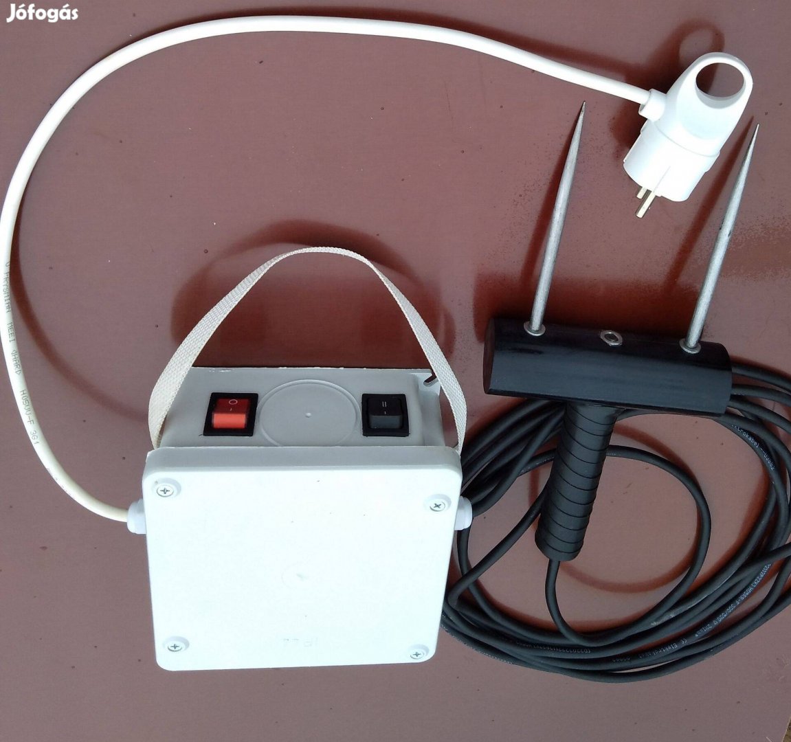5-méteres munka kábel anyaga gumi.Müanyag vastag anyagu doboz.A szurótüske átmérője 7mm a feketeszinü tömör kör alakú müanyag 40mm.Tekercselö álltal gyártott egyedi transzfomátor 80-130v teljesen biztos a sertéslefogásában, az állatok izom és testtömegéhez beállítható két különböző feszültségű kis és nagy súlyhoz tartozó kapcsolóval ellátott készülék {500kg}-ig és azon túl is {a nagysúlyú sertés biztos lefogása kizárólag csak nagyobb feszültséggel lehetséges. számtalan példa van arra amikor kisebb feszültség esetén a sertés nem ment le.Pl. 50v-os vagy még annál is kisebb feszültség ami csakis malacokra alkalmas. A kézben tartott szúróvilla markolati része a gumírozás alatt fém, ha sertés rádől nem törik el. A hálózati csatlakozó kábel rövid mérete 50cm azért van mert minden esetben mindenkinél a hely ahol a munkavégzés történik eltérö távolságú. Egyedi hosszúságú hosszabitót igényel. .{Az emberre egyes hiresztelések ellenére egyáltalán nem veszélyes Ha felhiv elmondom miért. Amúgy tudni kell hogy ez egy Szakma tehát ezt valaki vagy tudja vagy pedig tudatosan megtéveszt másokat. .Garancia a villamos szakmában ledolgozott 49 év.