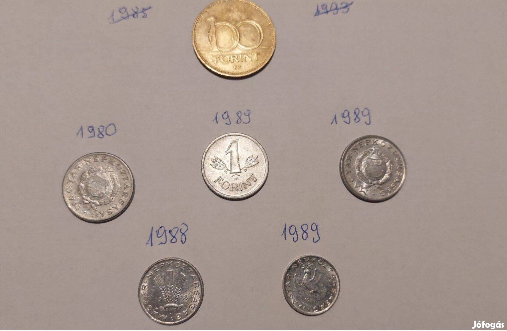 Alumínium 1 forintosok 1980-ból 1 db., és 1989-ből 2 db., 1 db. 20 filléres 1988-ból, és 1 db. 10 filléres 1989-ből. A 100 Ft.-os már hiányzik.Borítékban postázhatom.