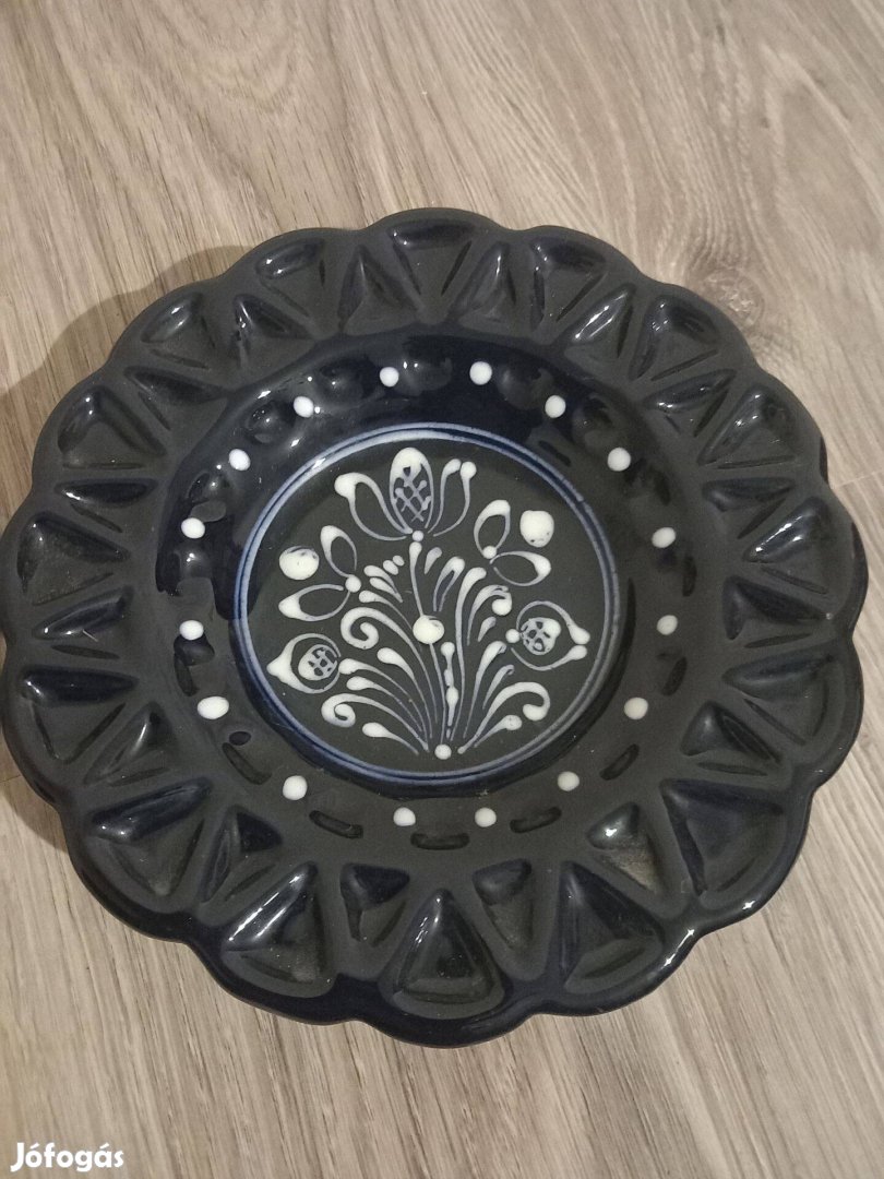 Átmérője 19 cm. Magassága 3 cm. Sötétkék alapon fehér színű mintával. A szélén körben hullámos díszítéssel. Nagyon szép, újszerű, hibátlan állapotban.
