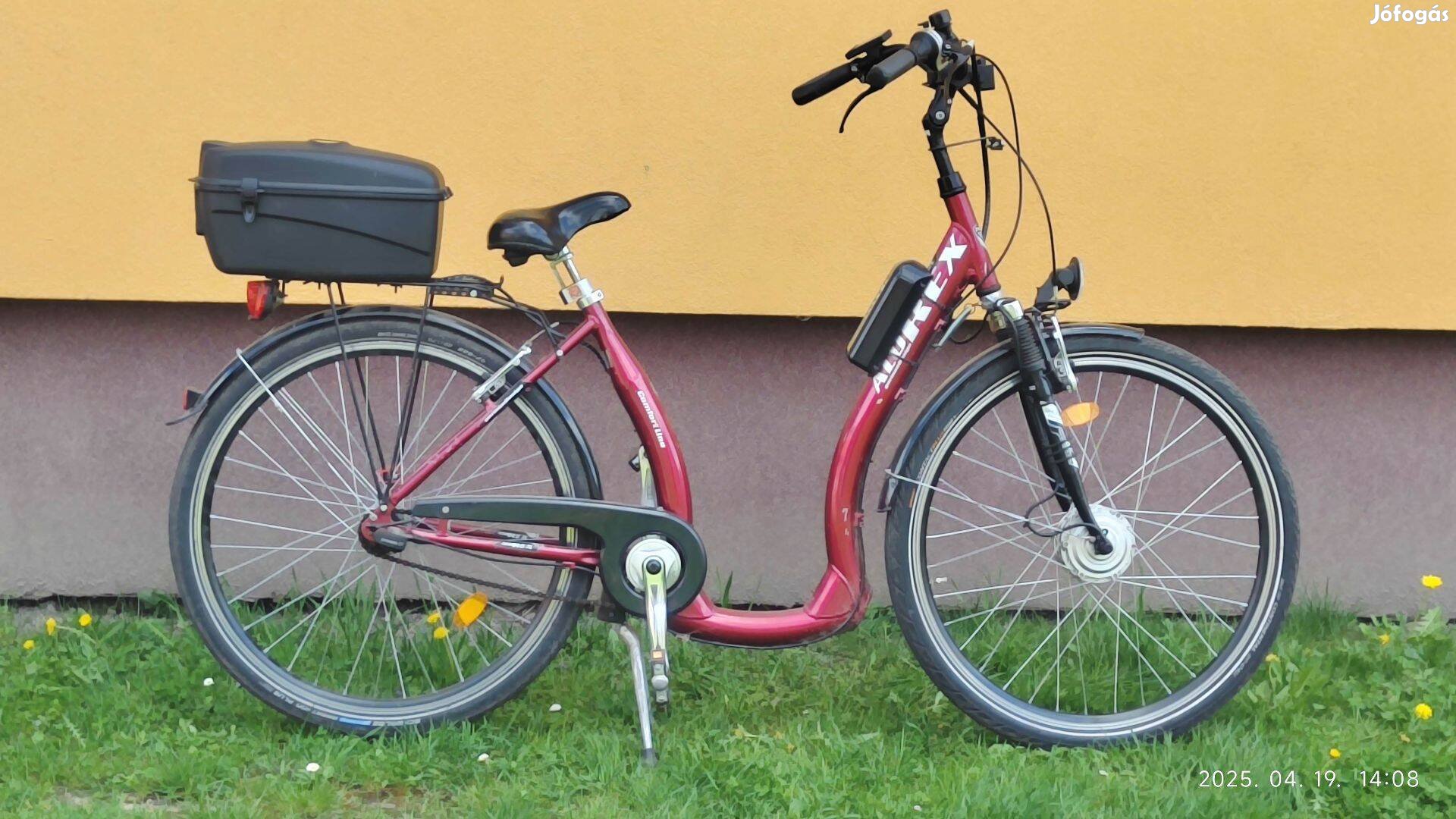 28"-os, teleszkopós villa, 7 sebességes agyváltó, sok szögben állítható kormánystucni, 250wattos 36V-os agymotor, 12ah lithium akku. Pedelec, fordulatszenzoros. Jó gumik.