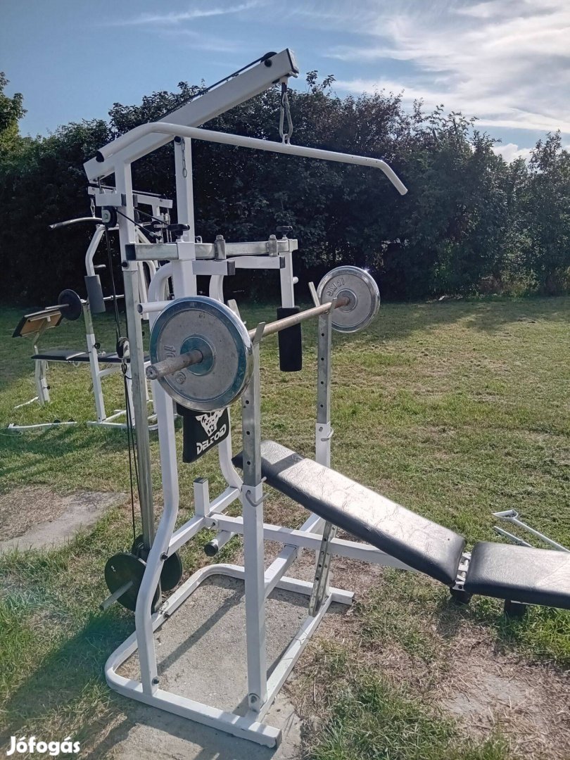 Állitható Kartávolságú csigás ülő mellgépes és hátgépes lábgépes dönthető fekpaddal rendelkező gyúrógépem 40kilós kétkezes krómozott súlyokkal, rúddal 150.000Ft- ert eladó! Totál drótköteles kivitelű! Massziv vastagfalú zártszelvényes edzőgép! Lapra szerelve autóban is szállítható! Hivjál bátran! .Gép ára 99.999Ft.