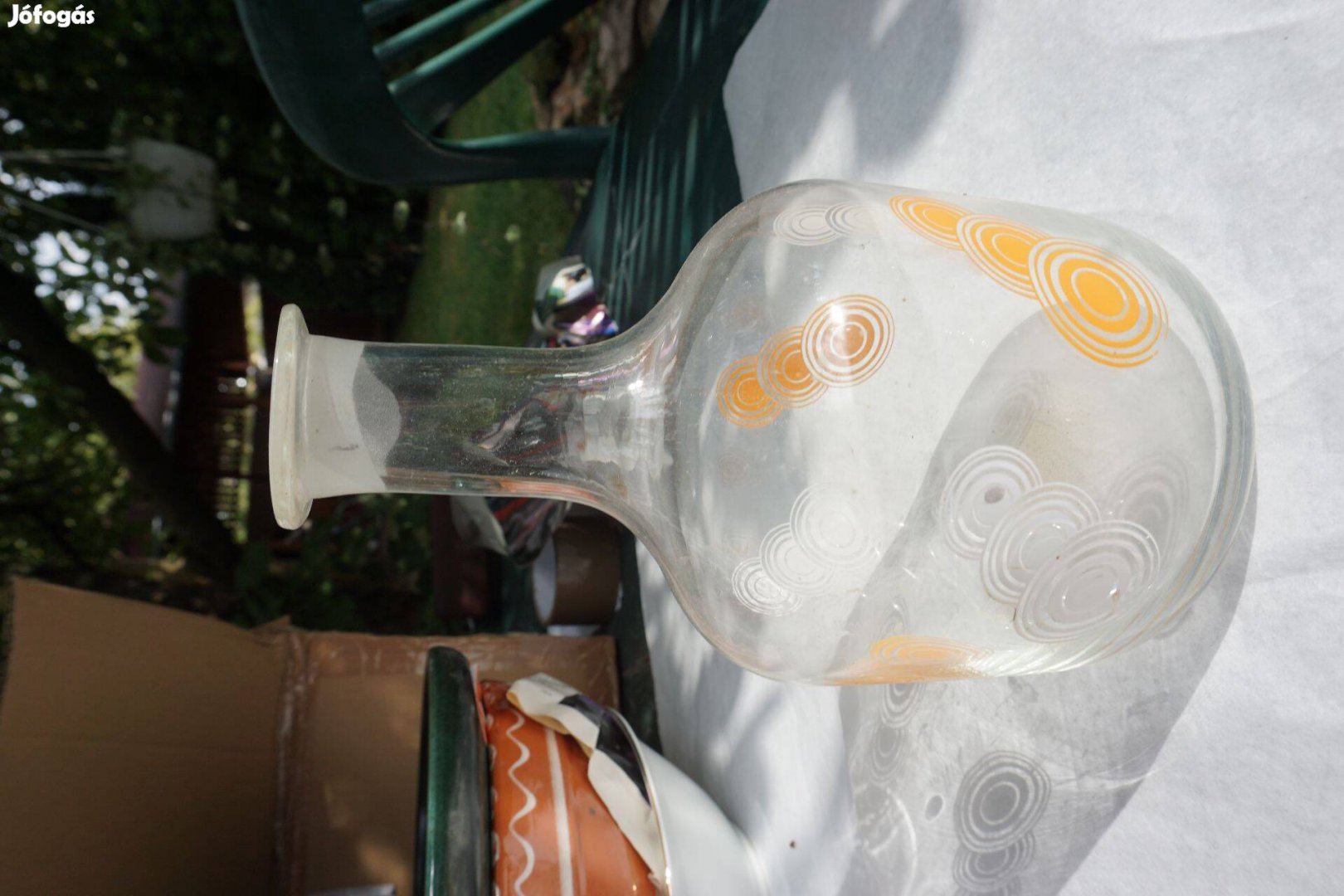 Borosüveg kiöntő hosszú nyakkal, és sárga spirál mintával díszítve, cca egy literes.