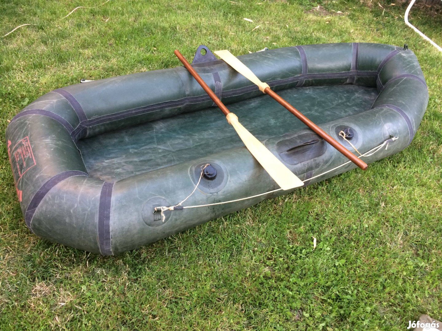 Eladó a képeken látható antik, orosz, katonai gumicsónak. Üzemképes állapotban, egy evező rántásra indul :). Gyári eredeti tartozékokkal, 2 db szétszedhető, fanyelű evezővel, foltkészlettel, pót dugóval-szelepekkel, hátizsákkal. Megkímélt állapotban. 1983-84-ből, méretei: 1 méter széles, 2,4 m hosszú. Szállítással megrendelhető. Olcsóbb szállítási lehetőséggel kapcsolatban (1500,-) kérem hívjon vagy írjon. Ára: 96000,-;