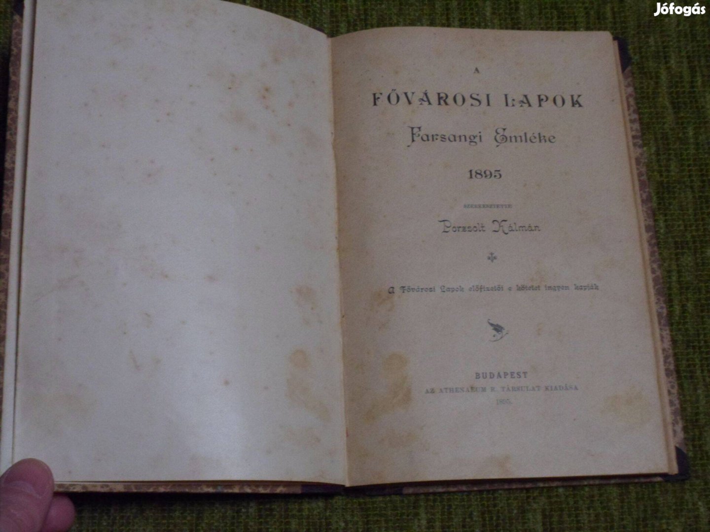 Porzsolt Kálmán: Fővárosi lapok farsangi emléke 1895. Újrakötött. A lapok az elején és a végén foltosak. A könyv végefelé a lapok felső sarkai meg vannak gyűrődve.