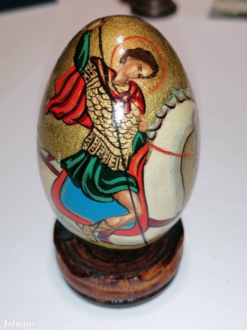 Eladó Sárkányölő Szent György aranyozott kézzel festett fa tojás fellelt állapotban.A feltüntetett ár irányár.
