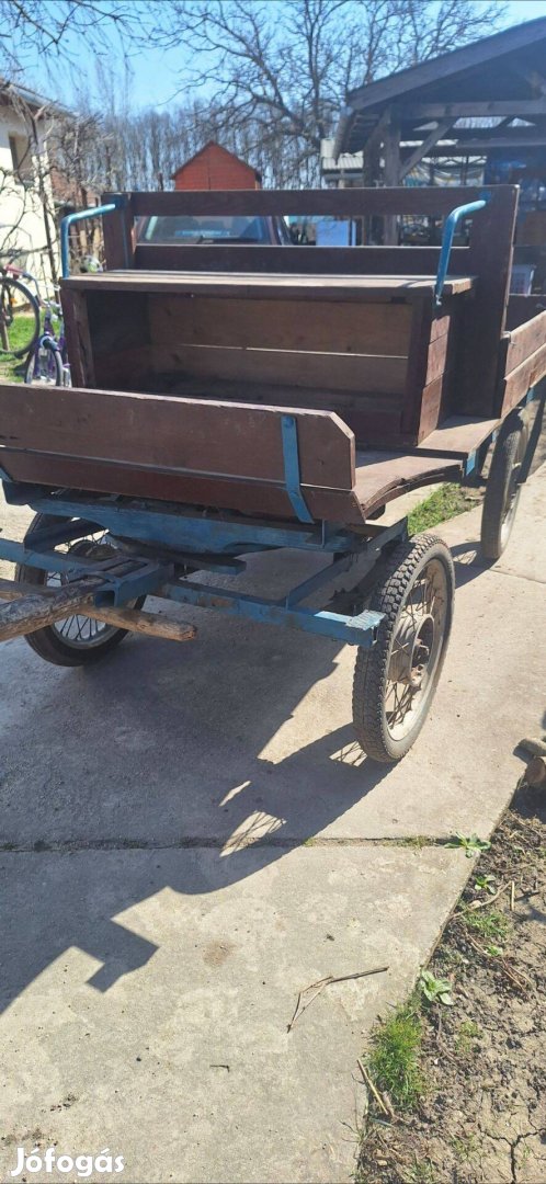 Nagyon könnyű szekér, póni, vagy szamár után való, képeken látható állapotban, időjárás álló rétegelt lemez platóval nagyon olcsón eladó. Plató mérete 125cm X 165cm . 69 ezer ft.