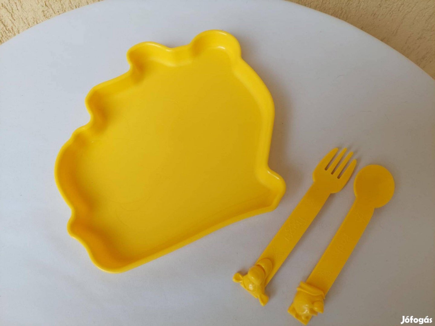 Egy cuki Micimackó formájú tányér, egy kanál Micimackó mintával és egy villa Tigris mintával.