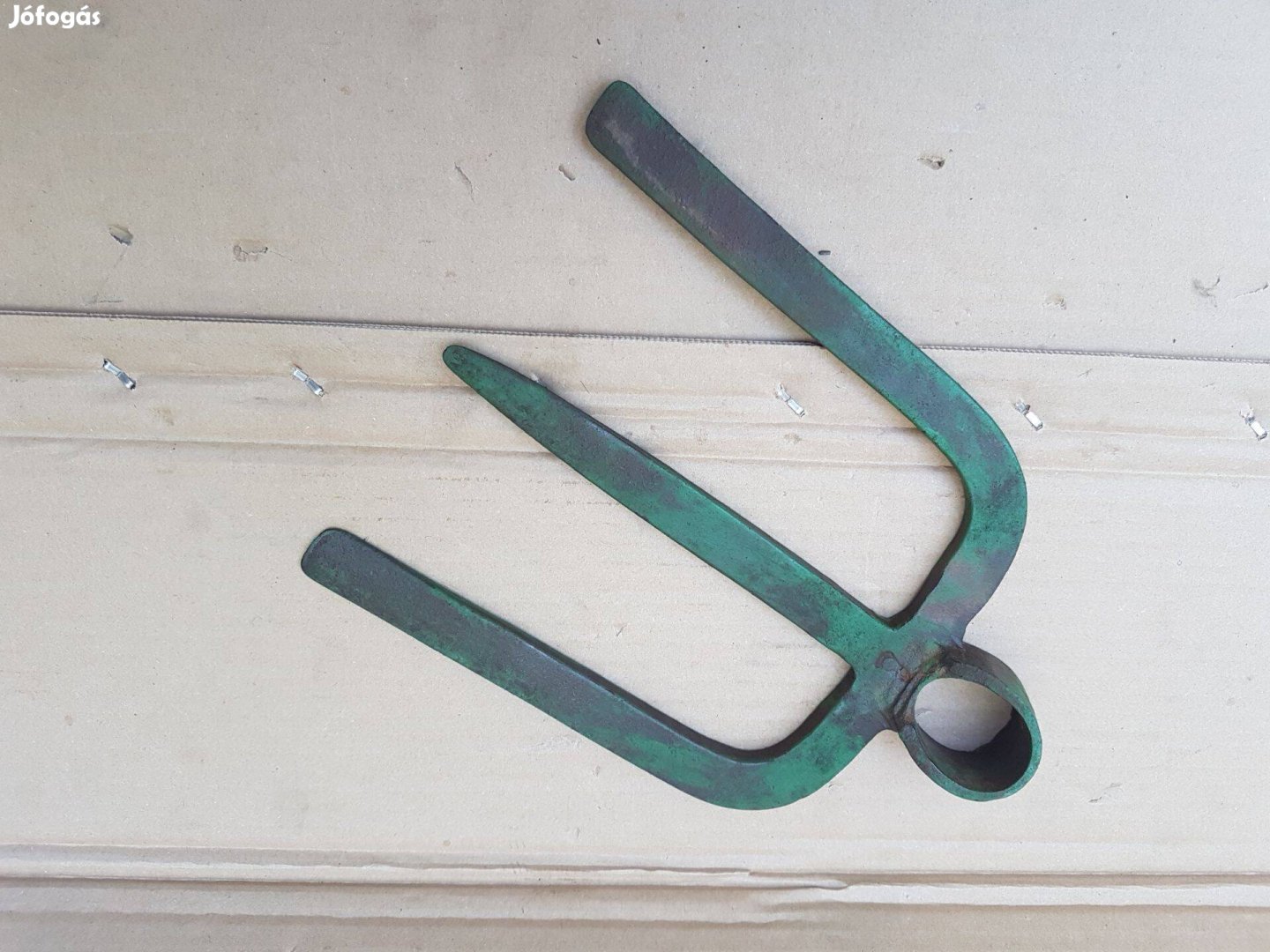 Eladó a képeken látható villa kapa. Különleges kerti szerszám. Teljes szélessége 19 cm, hossza 20 cm plusz a nyéltartó. Erős masszív régi kovácsolt szerszám. Megrendelhető. Ára: 5500,-;