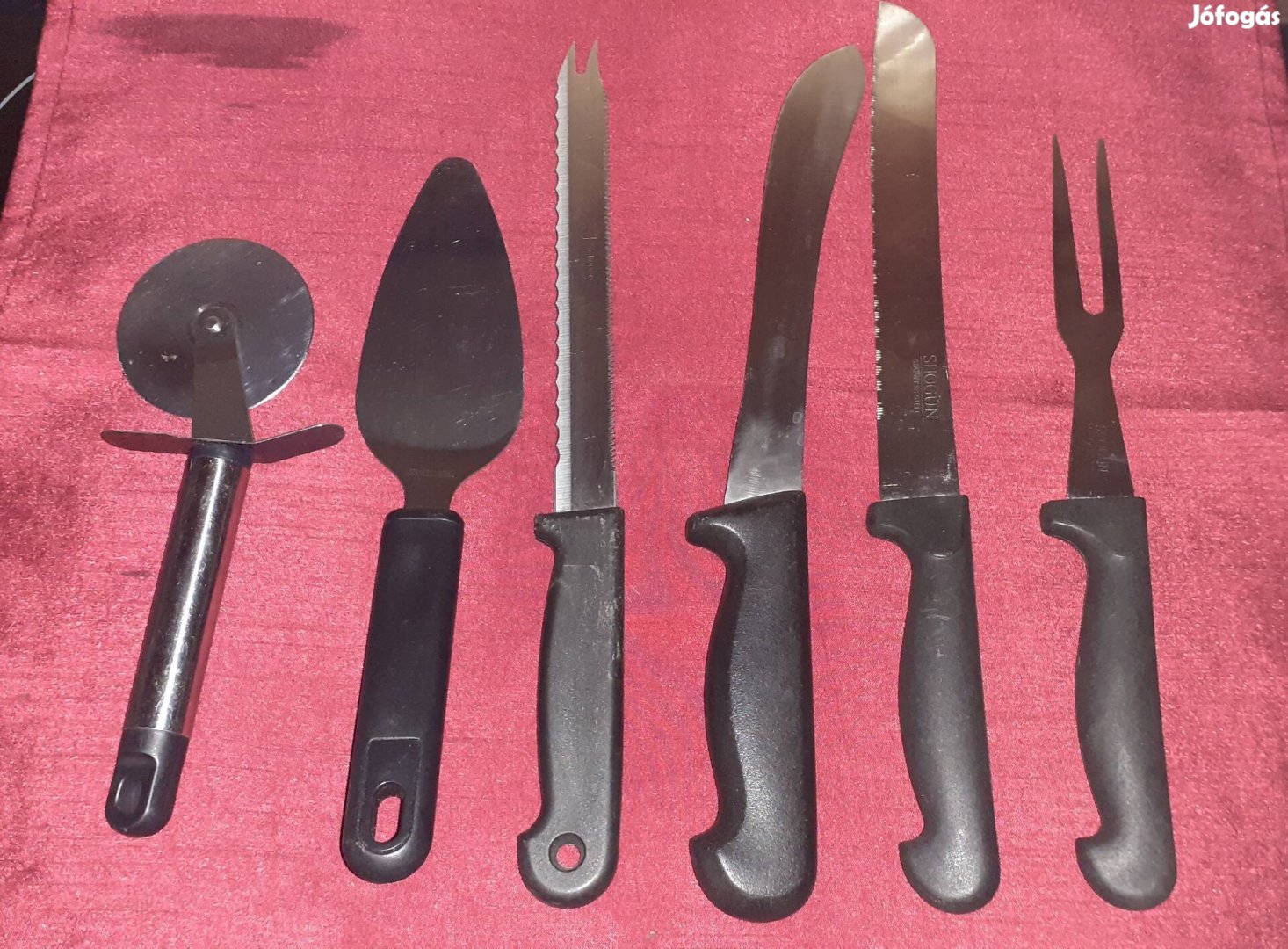 Eladó kihasználatlanság miatt és szekrény ürítés miatt a képeken látható konyhai eszközök egy pizzavágó, tortalapát, 3 db kés, egy fordító villa, használat jelei vannak rajtuk, de a használatát nem befolyásolja.