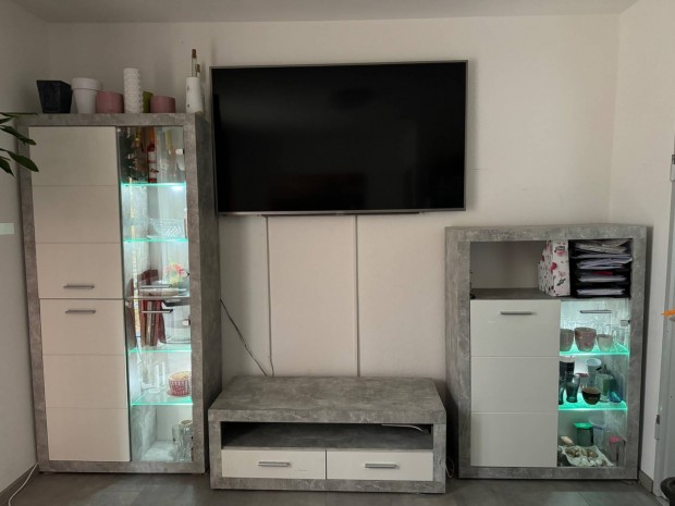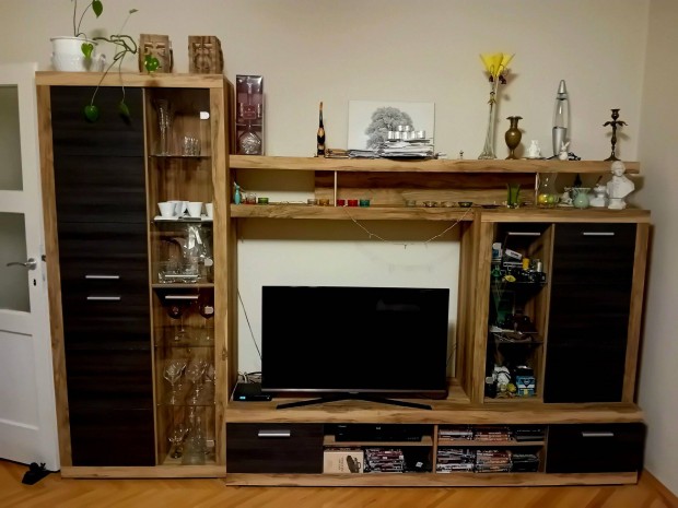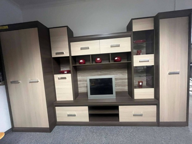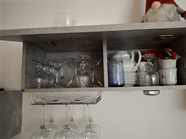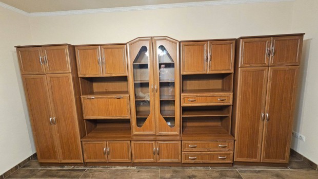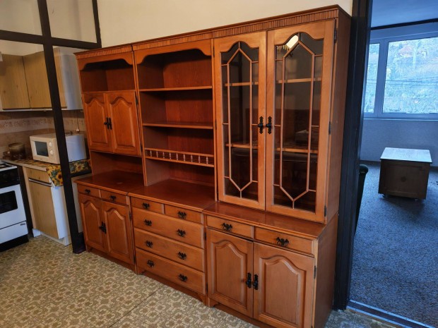 Áthidalós szerkénysor, vitrinnel, akasztós, polcos, fiókos részekkel