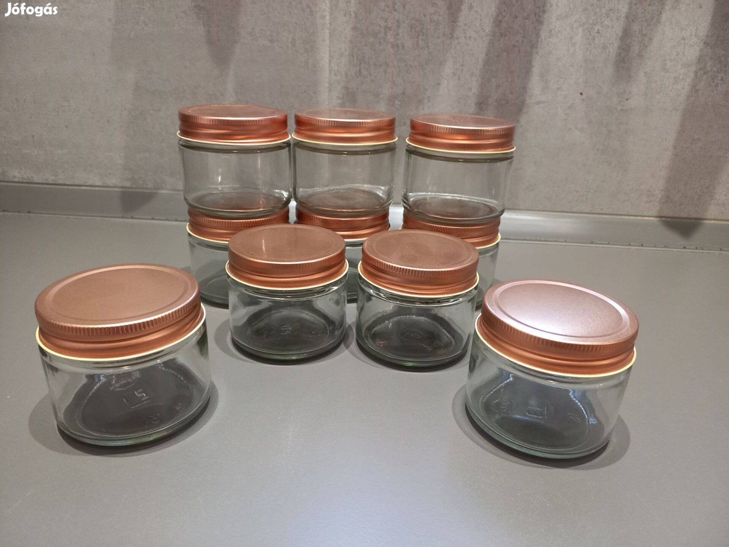 Eladó 10 db vastag falú üveg tároló. Korábban illatgyertyák voltak bennük, de tisztára mostam őket. Szilikon tömítésű hőálló tetővel záródnak. A formájuk elegáns. Alkalmasak apró dolgok, fűszerek, lekvárok stb. tárolására. Az adatok