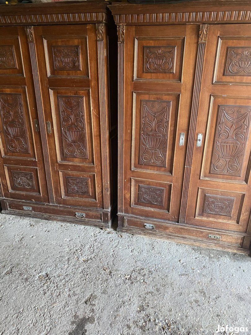 Eladó 2 db gyönyörű, régi faragott tömörfa ruhásszekrény.