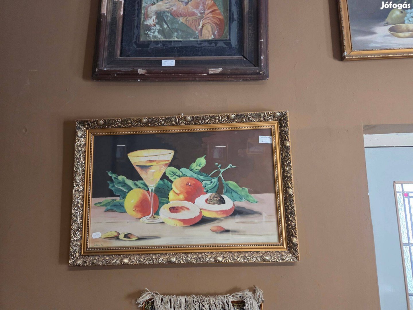 Jó hangulatú akvarell , mely gyümölcsöt és pezsgőspoharat ábrázol. Nagyon szép faragott keretben.