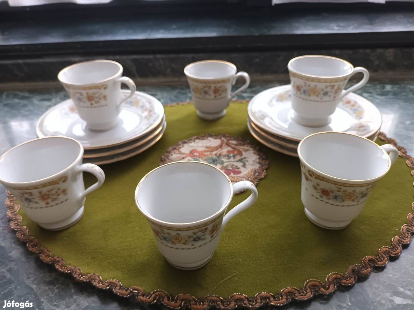 6 személyes aranyozott szélű kínai kávéskészlet új állapotban eladó. Sosem volt használva, csak vitrinben állt. Ára 5000 Ft. Átvehető Miskolcon vagy Budapesten, de más megoldás is lehetséges.