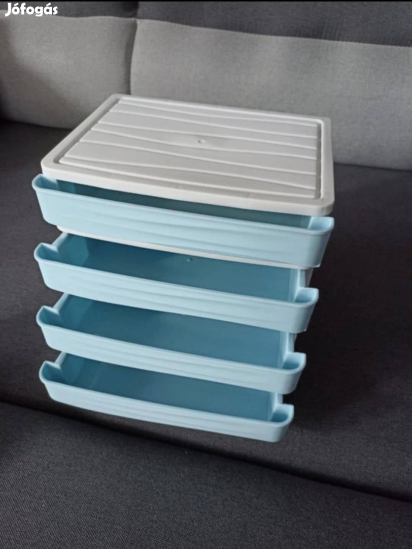 Kihasználatlanság miatt eladó eMAG-ról rendelt asztali smink rendszerező, tároló. 2 részes, egy 4 rekeszes tároló és a tetejére való levehető tartó. A tároló méretei: 23 cm szélesség, 22 cm magasság, 18 cm mélység. A tetejére illő tartó legnagyobb magassága kb. 8 cm.