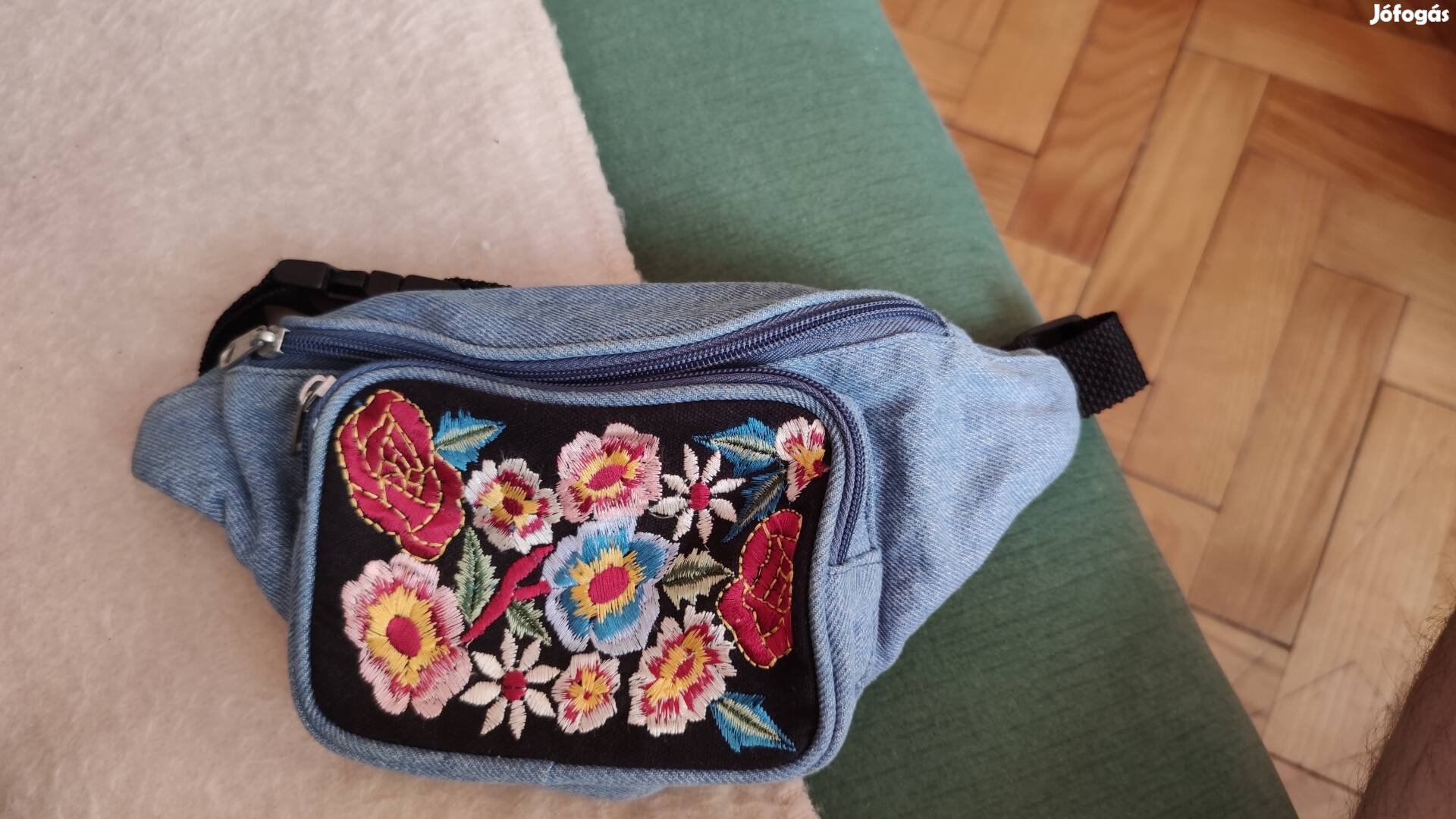 Boohoo, Újszerű, két rekeszes, Indiai kézzel hímzett virág mintás női övtáska, világoskék farmer anyagból!