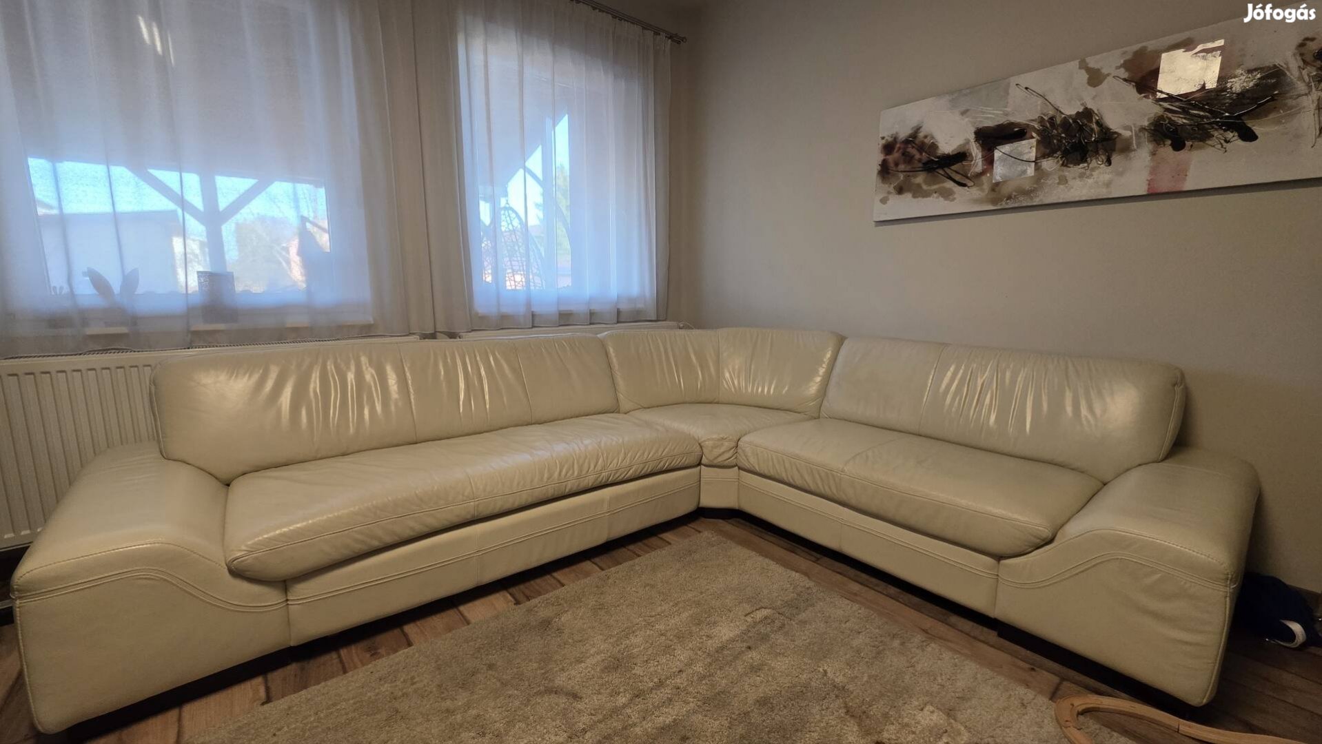 Eladó hasznalt bőr sarokgarnitúra, bézs szinű, 265×215cm,ágyazható.