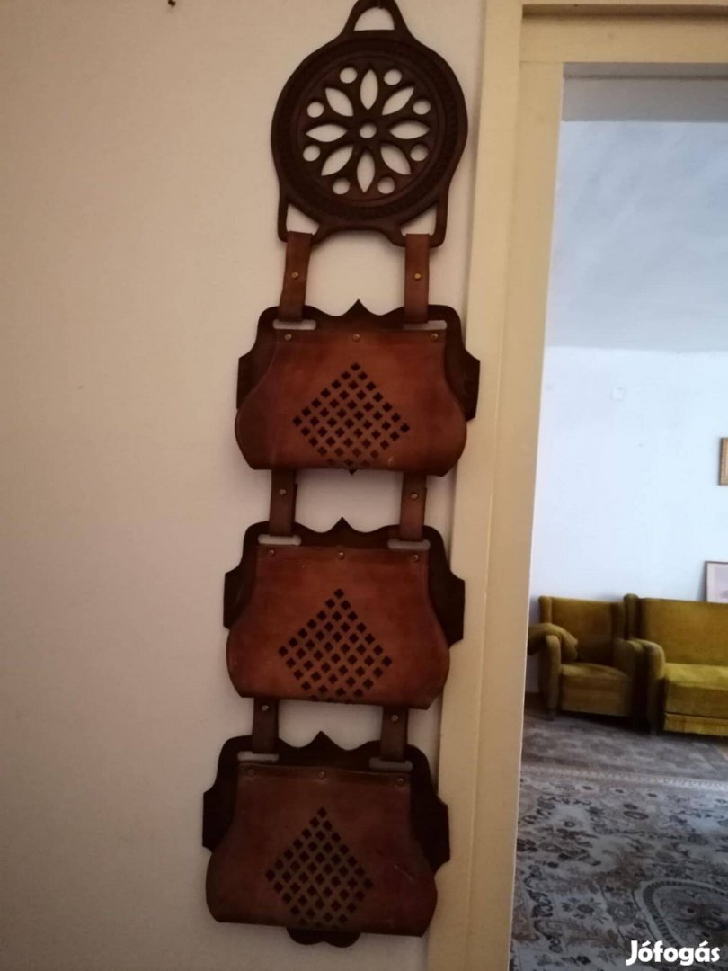 Miskolcon a Görgey utcában eladó egy szép, újszerű, barna bőr, egyedi fali újságtartó 3 rekeszes miskolci bőrdíszműves készítmény. Dekorációnak is kiváló. A helyszínről azonnal elvihető.
