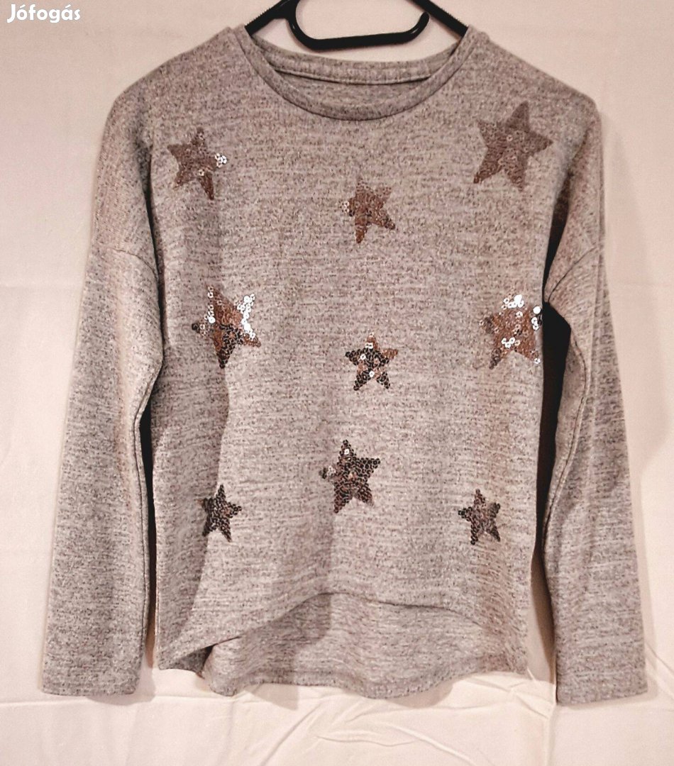 Puha, melírozott, kötött pulóver, elején csillogó, flitteres csillagokkal díszítve. Kényelmes, laza fazon, az alja hátul kissé hosszított. Méret: EUR 34, azaz XS.