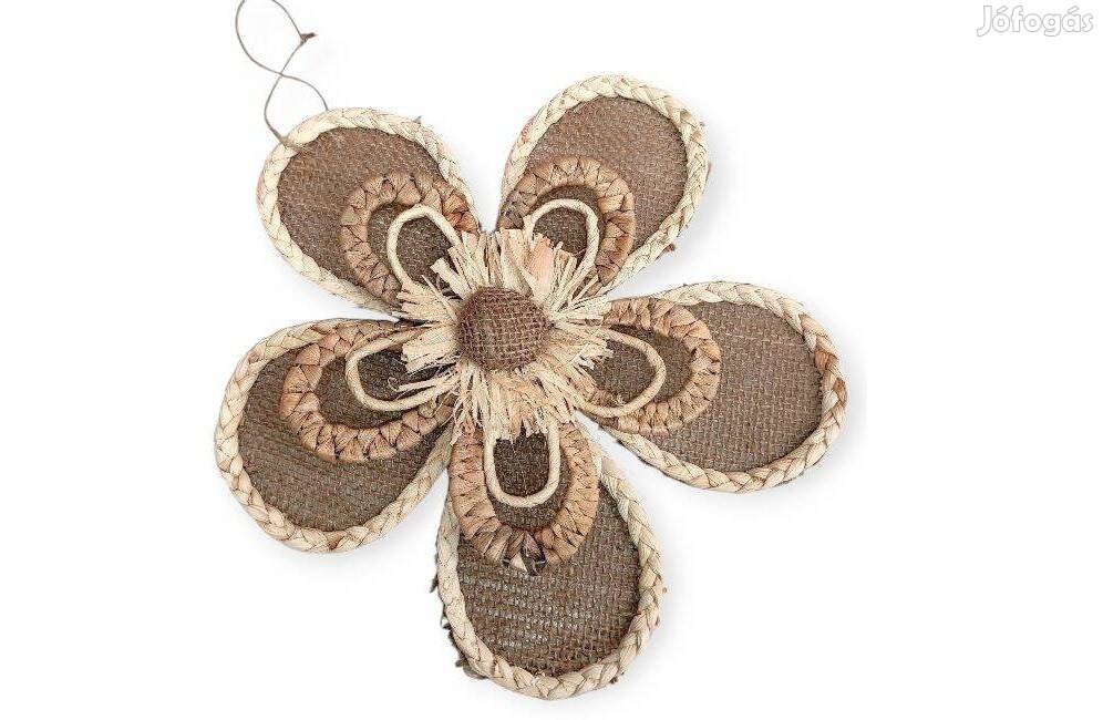 Ez a természetes hangulatot árasztó dekoratív virág fémkerettel készült, amelyet bézs színű juta és finoman szőtt szalmaelemek egészítenek ki. A dísz egyszerre idézi a vidéki stílust és a modern letisztultságot, így remekül illeszkedik különféle enteriőrökbe.