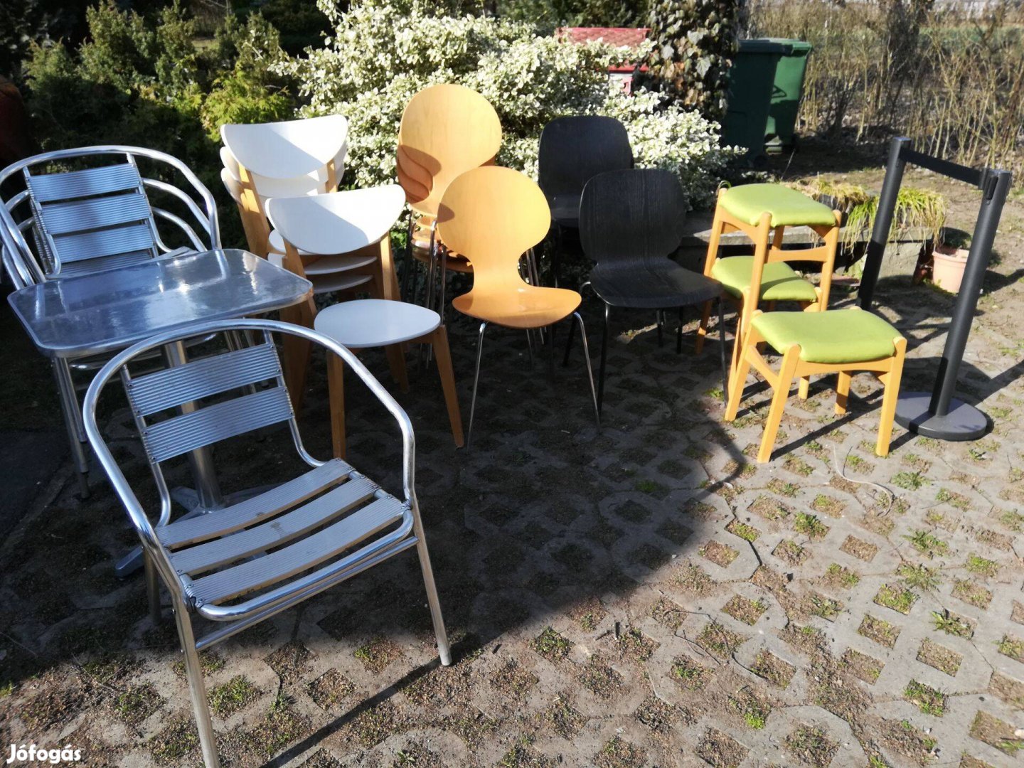 Eladó székek, kordon oszlopok, egy kültéri asztal. -4db. alu szék és az asztal 30e, állapot:5/3, -4db. fefér szék 20e, állapot:5/3,5 -6db. tölgy színű szék 36e állapot: 2db 5/3,5 ülőfelület karcos 4db. 5/4 4db. fekete szék 24e állapot:5/4 -3db.kis szék, puff magasság, tölgy zöld huzattal felújított 18e állapot:5/4 Kordon oszlopok fekete-2m szalaggal 8db. 48e állapot :5/5