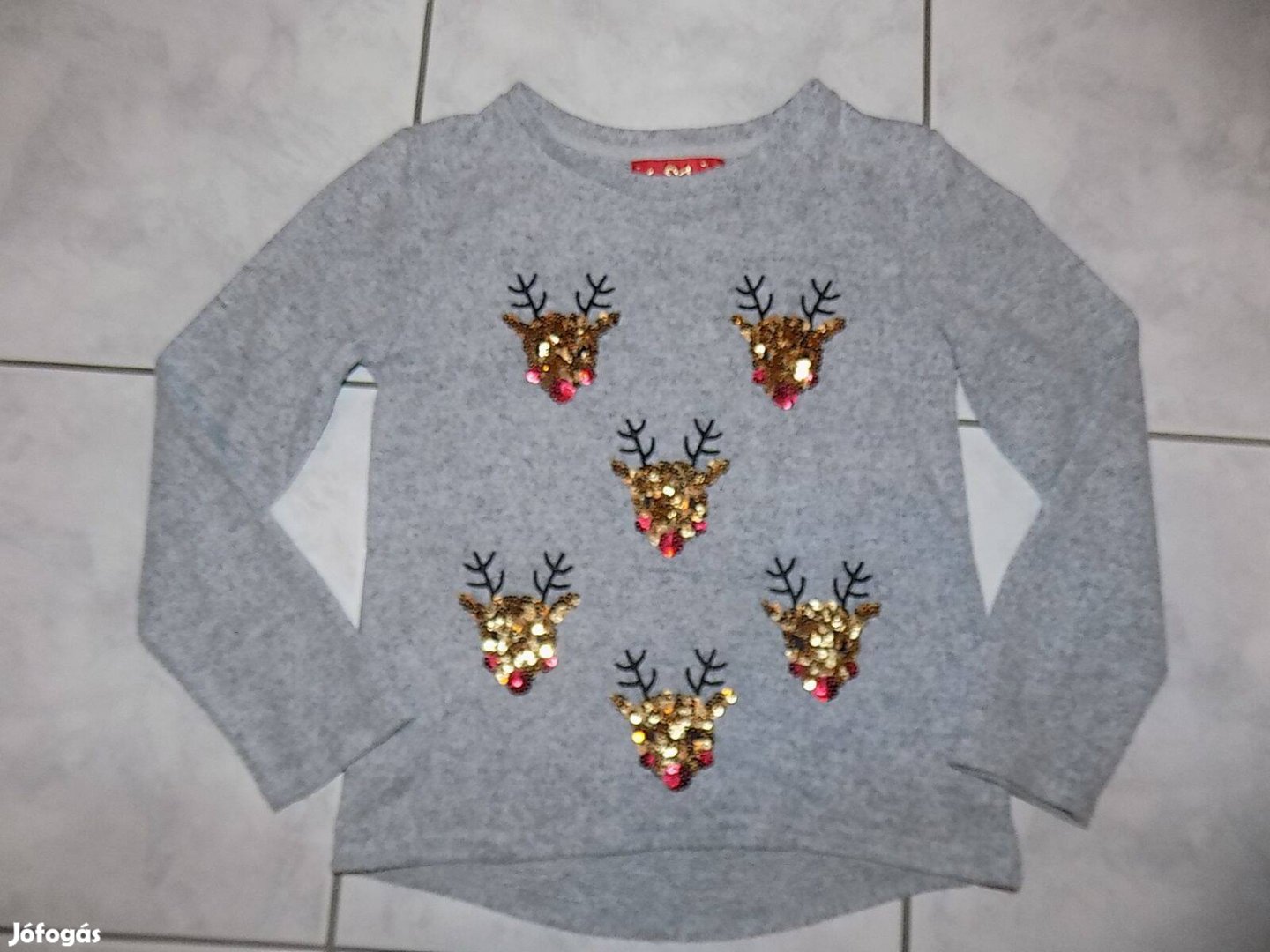 Nagyon, puha, finom anyagú kötött pulóver flitteres rénszarvas fejekkel az elején, hibátlan állapotban, 7-8 évesre.