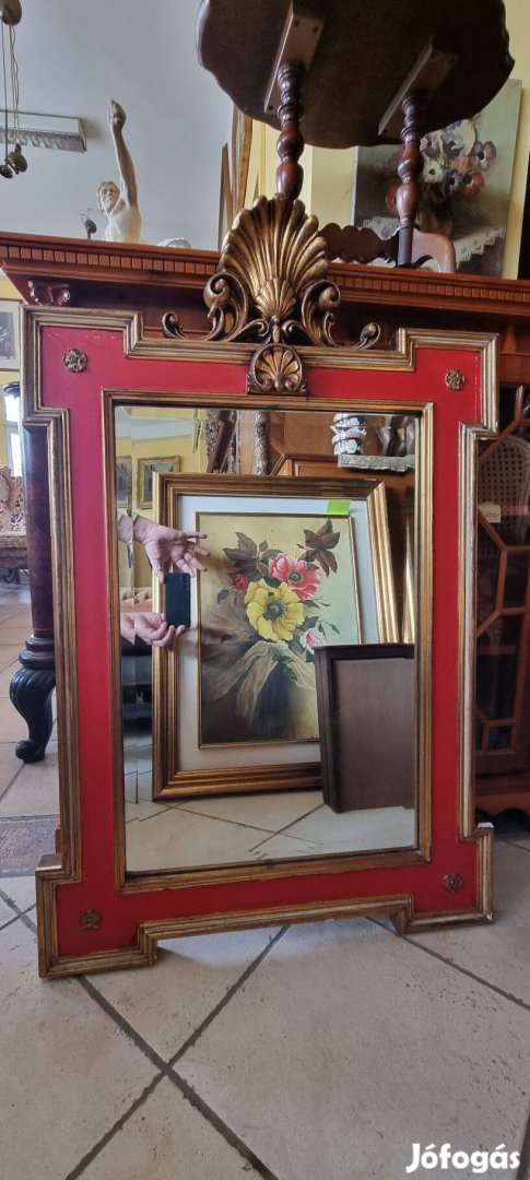 Különleges faragott falitükör. Piros -arany színű keretben. Metszett tükörrel.