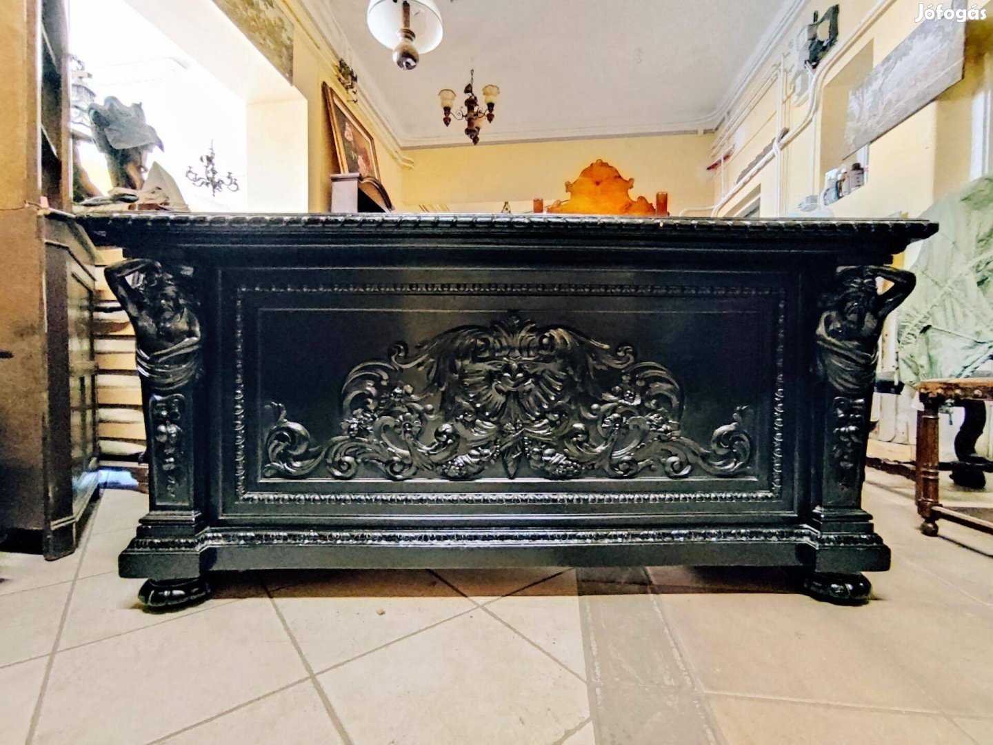 Gyönyörű , dúsan faragott neo-renesans íróasztal. Fekete színben. A két oldalán figurális faragás is található. A tetején új bőrlappal. A belső része mahagóni.