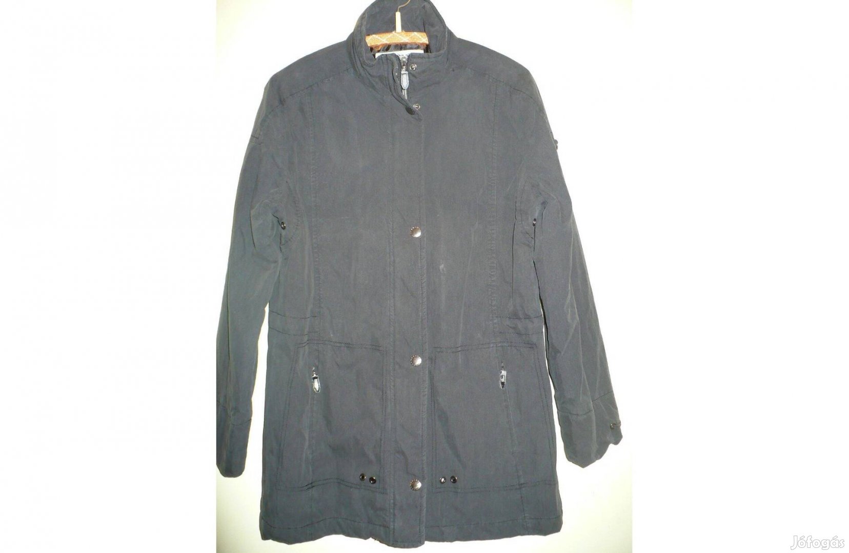 Fekete női kabát, S-es méretben, jó állapotú, inkább átmeneti jellegű, cipzáros, patentos, derekán belül összehúzható, a vaku miatt a szín nem tökéletes, sötétebb