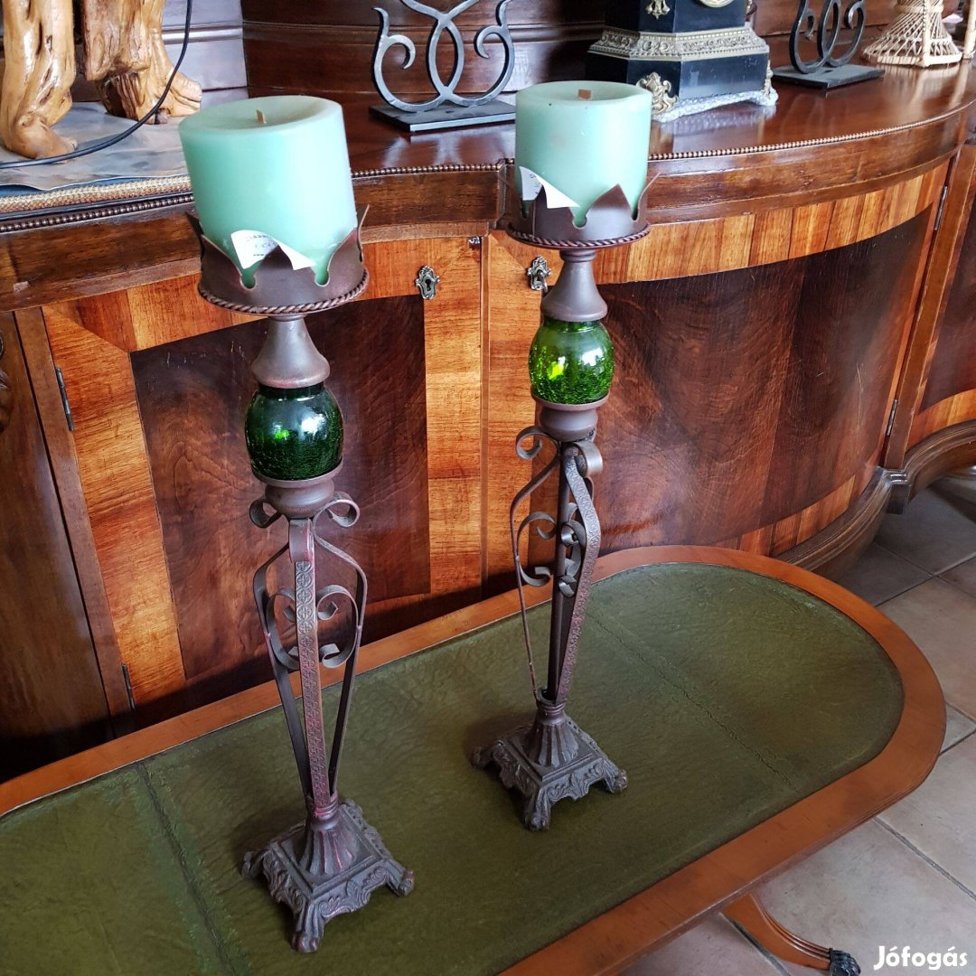 Eladó 2 db fém gyertyatartó. Barna színű, zöld üveggömbbel díszítve, nagy méretű zöld gyertyával.