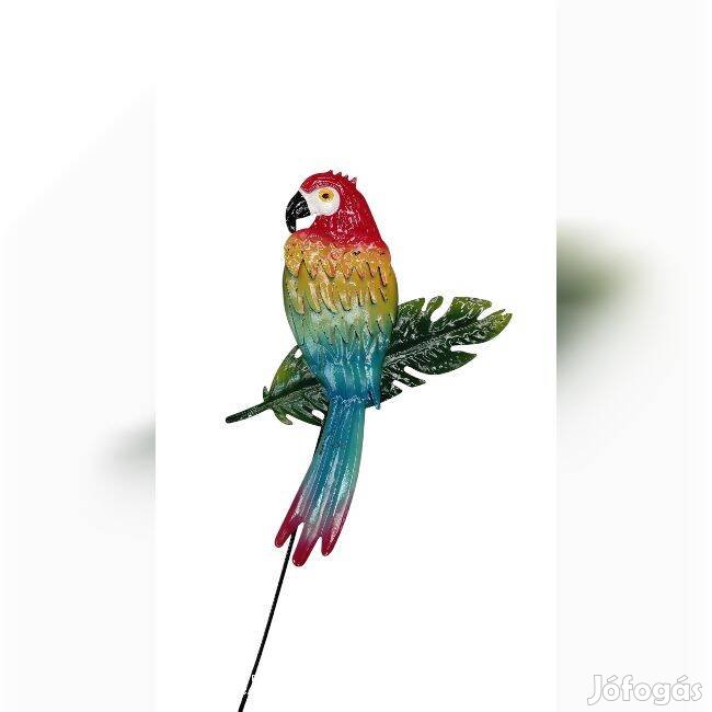 Dekoratív fém kerti leszúrható dísz, színes papagájmintával.
