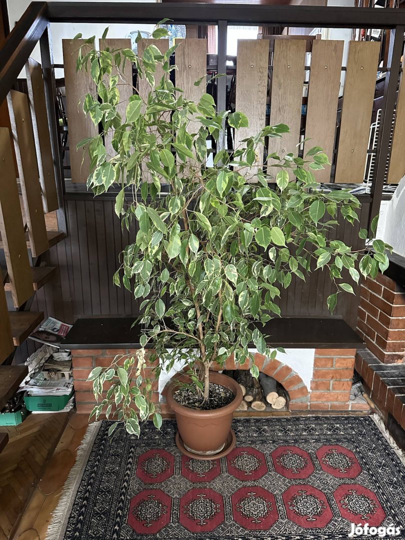 Eladó egy Ficus benjamina 'Variegata' (tarka benjáminfikusz) helyhiány miatt. Nagy méretű, dekoratív, fás szobanövény, zöld-fehér tarka lombozattal.