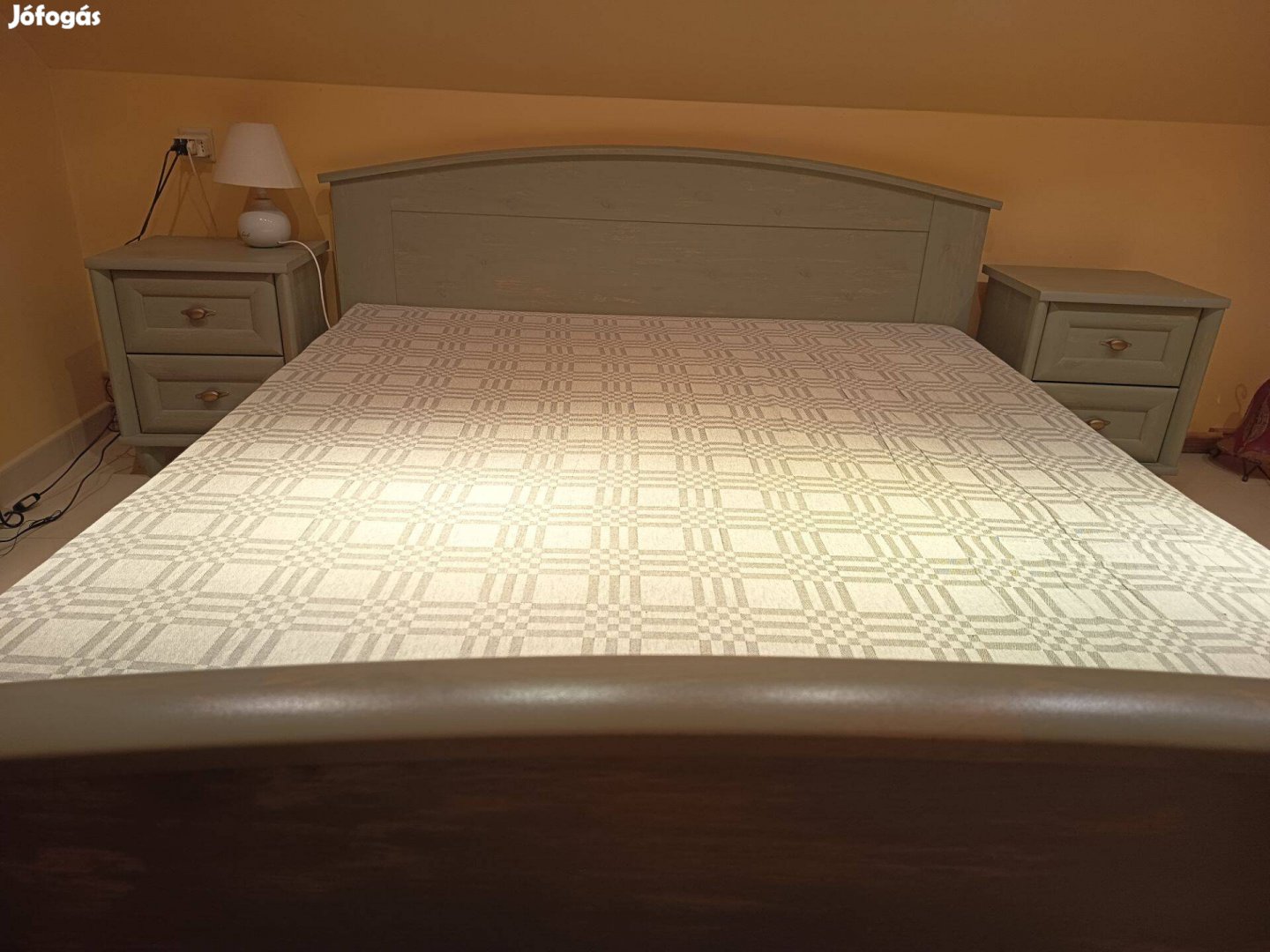 Lapraszerelt kétszemélyes franciaágy ágyráccsal, habszivacs matraccal, 200X160 méretben és hozzáillő 2 darab éjjeliszekrénnyel, antikolt zöld színben Felsőzsolcán eladó.