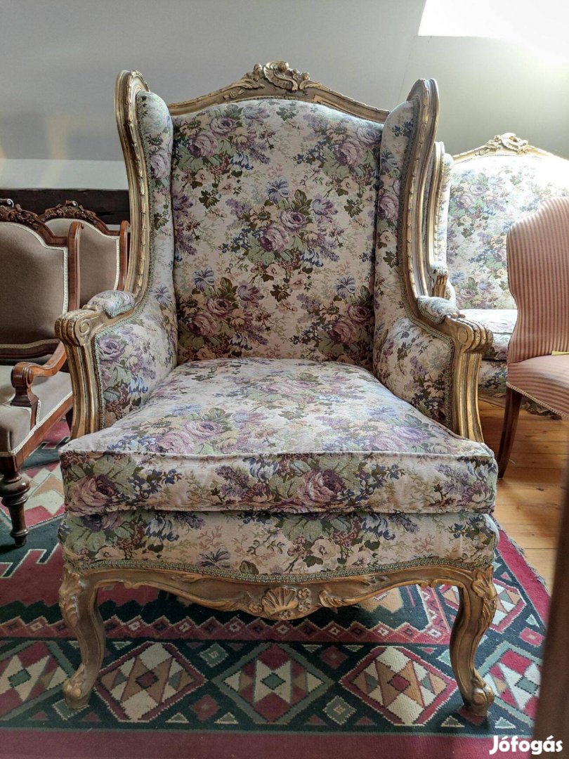 Nagyon szép 2 db fülesfotel. Antikolt arany fa résszel, barokk mintájú faragással a tetején és az ülőlap alatti részen, kecses lábakkal. Goblen hatású nagyon szép kárpittal.