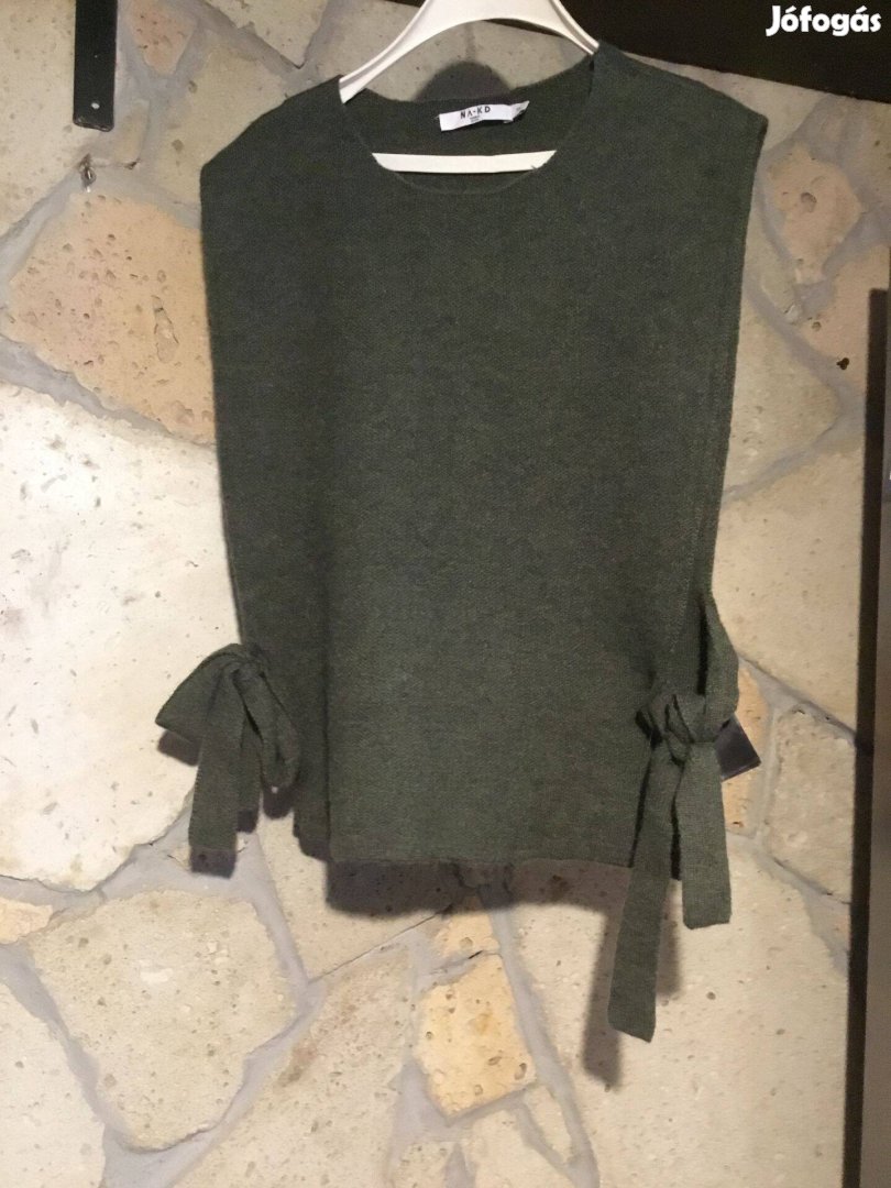 Méretprobléma miatt eladó a képeken látható sosem viselt, különleges szabású, oldalvarrás nélküli, megkötős, XS méretű, NA-KD márkájú, zöld kötött gyapjú mellény.